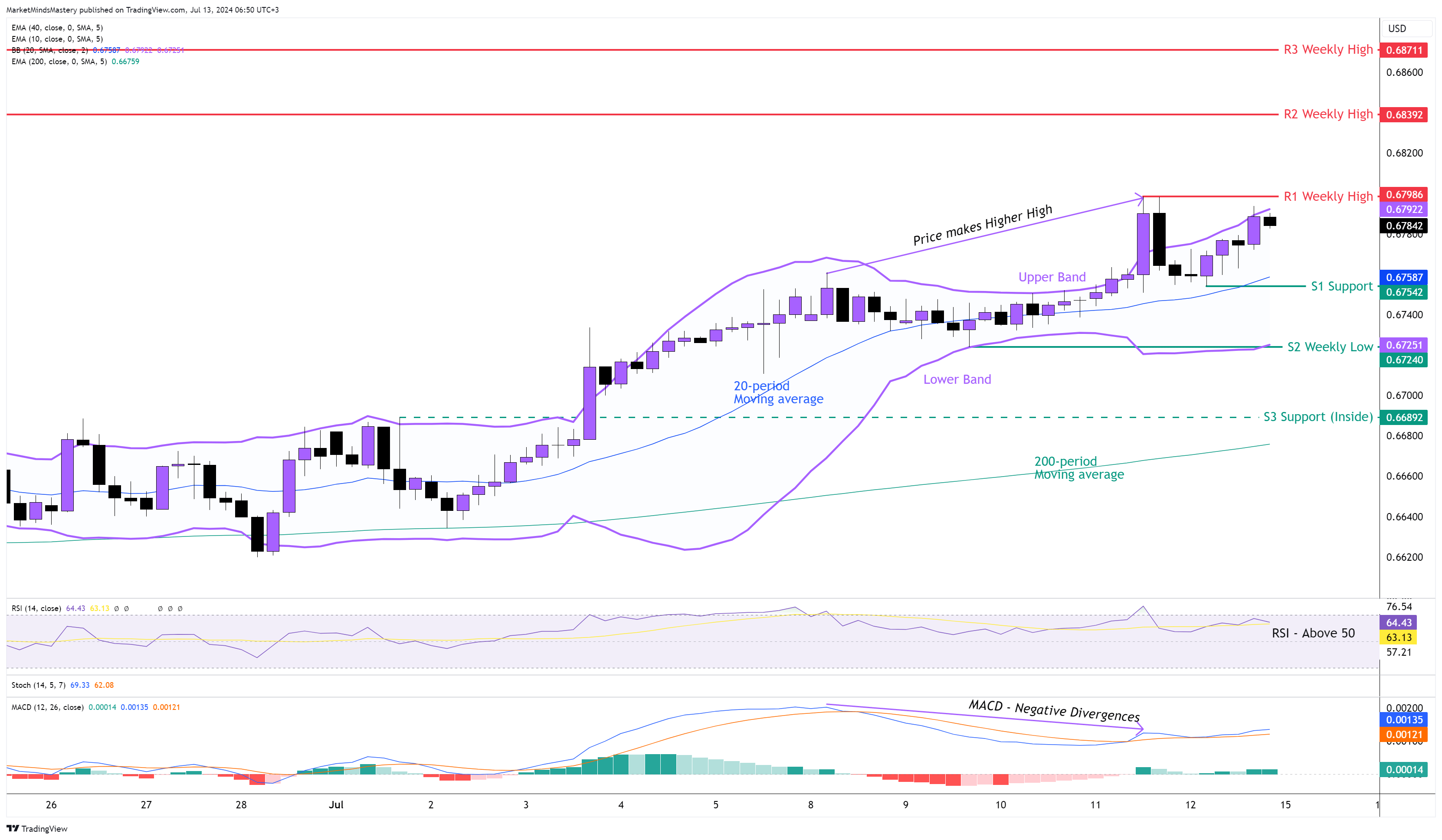على العكس من ذلك، إذا انخفض السعر وتحرك لأسفل، فإن منطقة الدعم الأولى، S1، ستكون 0.67542، والتي تقع فوق المتوسط المتحرك لـ 20 فترة. إذا اخترق السعر S1 وانخفض أكثر من ذلك، فإن منطقة الدعم التالية، S2، ستكون قاع الأسبوع السابق، حول 0.67240، والتي تقع عند نفس مستوى السعر مثل النطاق الديناميكي الأسفل لمؤشر بولينجر باند. وأي حركة هبوطية أخرى ستجد الدعم التالي، S3، عند مستوى 0.66892 تقريبًا;