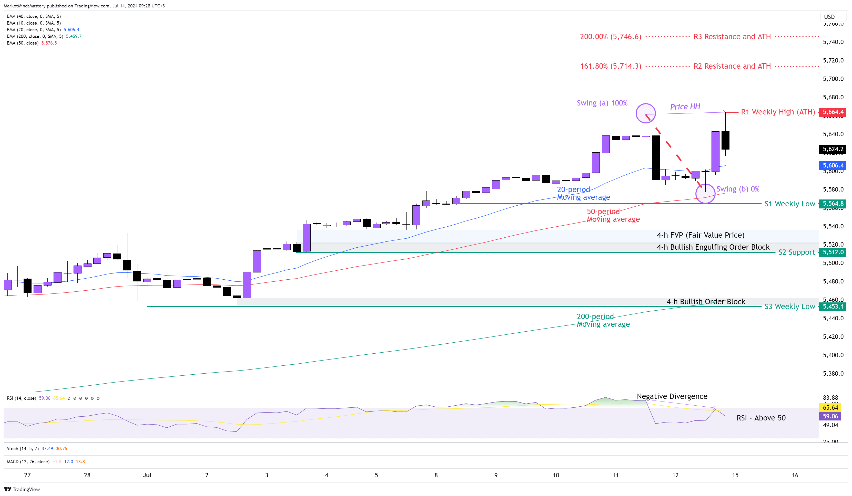 وبالإضافة إلى ذلك، فإن كلا المتوسطين المتحركين أعلى من المتوسط المتحرك البطيء لـ 200 فترة. استنادًا إلى تحليل التأرجح، لا يزال هيكل السوق في اتجاه صعودي. بدءًا من يوم الاثنين، إذا اتبع السعر مؤشر القوة النسبية ؛ التباعدات، وبدأ في التحرك لأسفل، فإن منطقة الدعم الأولى، S1، ستكون أدنى مستوى في الأسبوع السابق، حوالي 5564 دولارًا. إذا لم يبقى السعر فوق S1 ويخترقه، فإن أول شيء سيحدث هو أن الاتجاه الصعودي لمدة 4 ساعات سينتهي. والأمر الثاني هو أن السعر يمكن أن يستمر في التحرك هبوطيًا حتى يصل إلى مستوى دعم S2، حوالي 5512 دولارًا. يعتبر هذا المستوى السعري مهمًا نظرًا لوجود (سعر القيمة العادلة) و و كتلة أمر الابتلاع الصعودي لمدة 4 ساعات حول هذا المستوى. يمكن أن يصبح كلاهما عاملين داعمين مهمين للحفاظ على السعر فوق دعم S2. في حالة كسر S2 وانخفاض السعر أكثر، فإن منطقة الدعم التالية، S3، ستكون منطقة الدعم التالية S3 هي أدنى مستوى للأسبوع القديم حول 5453.