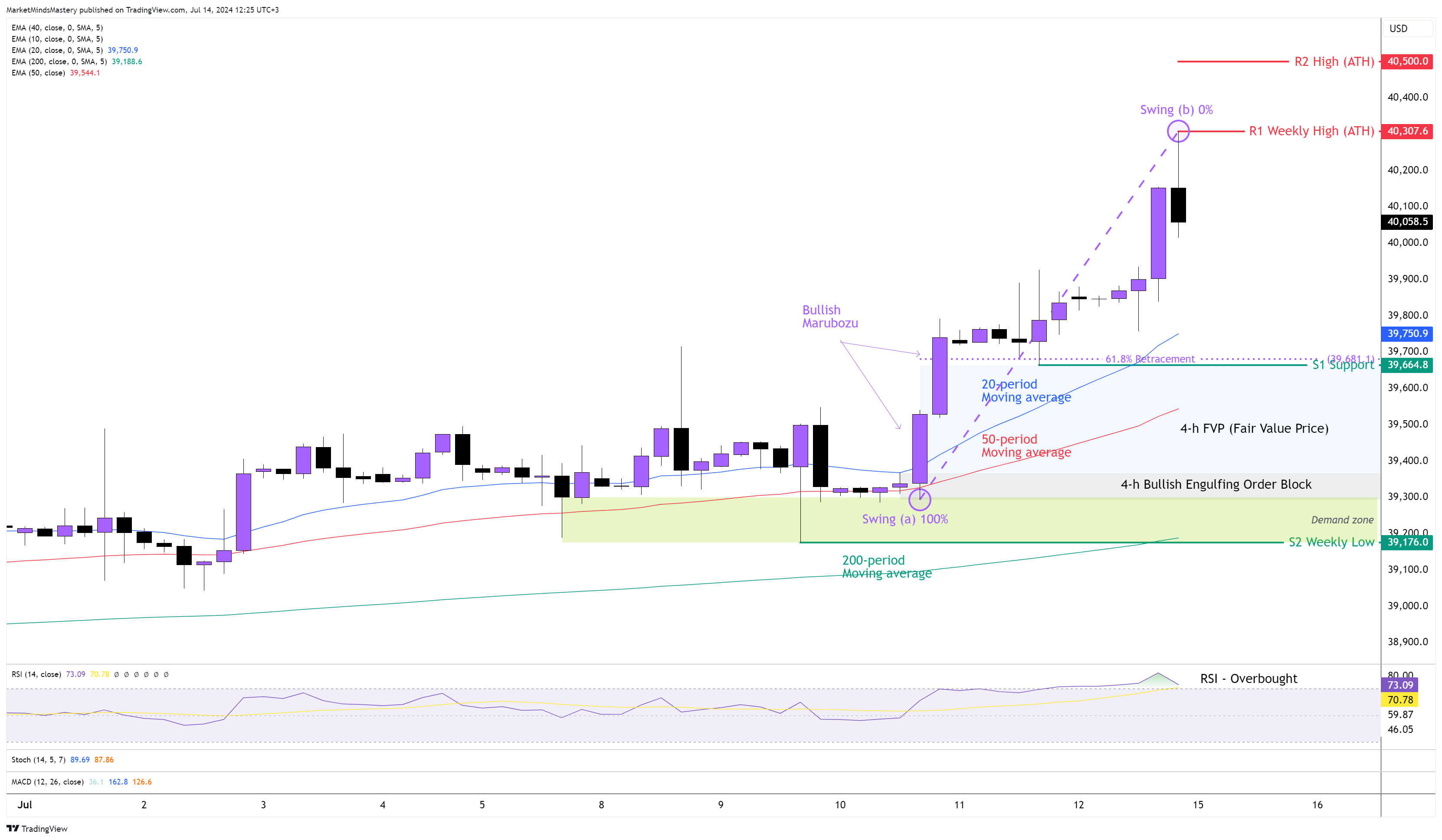 في الأسبوع الماضي، اخترق السعر الأسبوع الماضي خارج النطاق العلوي من مؤشر بولينجر باند، وأنشأ شمعة أسبوعية صاعدة. أنشأت الشمعة الأسبوعية شمعة أسبوعية جديدة (أعلى مستوى على الإطلاق)، وعلى الرسم البياني للأربع ساعات، أنشأ السعر اتجاهًا صعوديًا في سلسلة من الارتفاعات الأعلى والقيعان الأعلى. حدث الاختراق يوم الأربعاء مع شمعتين صاعدتين ماروبوزو ثنائية الاتجاه (صعودي)، كما هو موضح على الرسم البياني. خلال هذا التحرك الصعودي، أنشأ السعر كتلة أوامر صعودية مبتلعة صعودية، وترك وراءه سعر القيمة العادلة.فترة 20 فوق المتوسط المتحرك لـ 50 فترة، و في نفس الوقت فوق المتوسط المتحرك لـ 200 فترة وهذا مؤشر صعودي. ونظرًا لأن المؤشر مؤشر تذبذب مؤشر القوة النسبية في حالة ذروة الشراء، فهذا يشير إلى أن سوق US30 في اتجاه صعودي قوي. واعتبارًا من يوم الجمعة، كانت الشمعة الأخيرة شمعة هابطة، ويمكن أن تشير إلى قمة التأرجح بدءًا من يوم الإثنين. إذا انخفض السعر وتحرك للأسفل، فأول ما نتوقعه هو تصحيح السعر. إذا حدث ذلك، فمن المتوقع أن يتحرك السعر للأسفل حتى منطقة الدعم S1، والتي تتكون من مستوى 39664 دولارًا وفيبوناتشي نسبة جولدر، 61.8%. في حالة اختراق السعر لمنطقة الدعم S1 وانخفاضه أكثر، فإن منطقة الدعم التالية، S2، ستكون منطقة الدعم التالية S2 هي أدنى مستوى في الأسبوع السابق، حوالي 39176 دولارًا. عند هذا المستوى السعري، يمكن أن يكون كل من Order Block، والمتوسط المتحرك لفترة 200، وFVP، و ومنطقة الطلب، عوامل داعمة لبقاء السعر فوق دعم S2. بالمقابل، إذا استمر السعر في التحرك لأعلى، ستكون منطقة المقاومة الأولى، R1، هي أعلى مستوى في الأسبوع السابق، وهو المتوسط المتحرك لفترة 200 يوم، عند حوالي 40300 دولار.