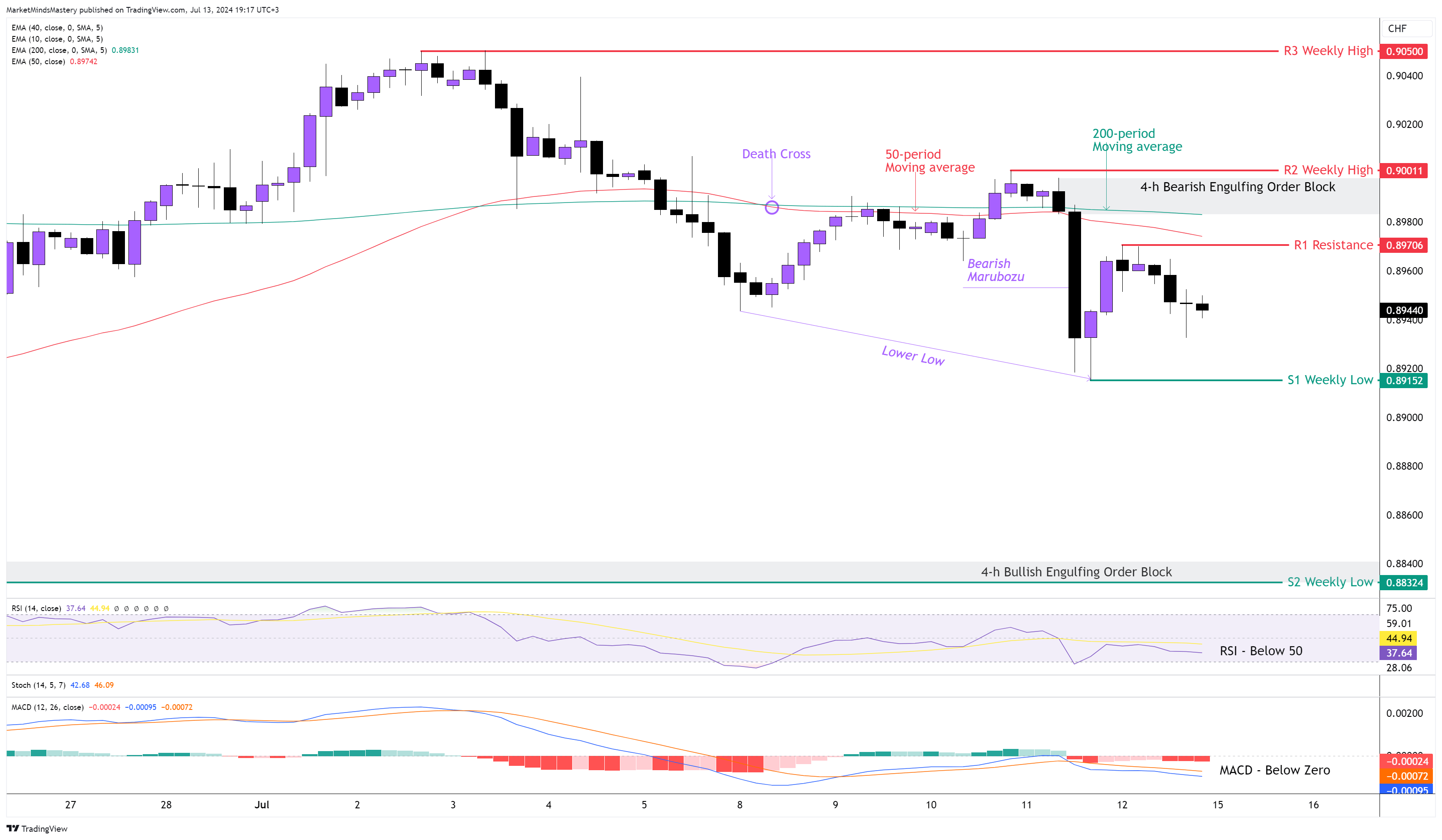 في أعقاب التوقعات الأسبوعية للأسبوع السابق، حافظ السعر على تشكيل القمم المنخفضة والقيعان المنخفضة. واستمر في حركته الهبوطية حيث دعم الجزء الخاص بالاقتصاد الكلي ضعف الدولار الأمريكي بسبب تقرير مؤشر أسعار المستهلكين الأمريكي. وتحرك السعر على طول الطريق حتى دخل الدعم الأسبوعي S2 في كتلة أوامر الابتلاع الهابطة التي أشرنا إليها على الرسم البياني وارتد منها. وقد عبرت فترة 50 فترة دون المتوسط المتحرك لفترة 200 فترة ، وهذا له آثار هبوطية لهذا الإطار الزمني لمدة 4 ساعات. كما خلقت شمعة ماروبوزو الهبوطية التي تسببت في انخفاض السعر يوم الخميس الماضي هيكلًا جديدًا للسوق من قاع منخفض. لا يزال مؤشر RSI دون 50 وهذا له آثار هبوطية. لا يزال مؤشر MACD أيضًا تحت خط الصفر وهذا أيضًا هبوطي. وابتداءً من يوم الاثنين، إذا استمر السعر في التحرك لأسفل، ستكون منطقة الدعم الأولى، S1، هي أدنى مستوى في الأسبوع السابق، حول 0.8915. أما إذا اخترق السعر ما دون S1 وواصل التحرك لأسفل، فهذا يعني أن الاتجاه الهبوطي سيستمر، وستكون منطقة الدعم التالية، S2، حول 0.8832، وهو قاع أسبوعي آخر. عند هذا المستوى السعري، لم يتم اختبار نموذج "كتلة أوامر الابتلاع الهبوطية" حتى الآن.