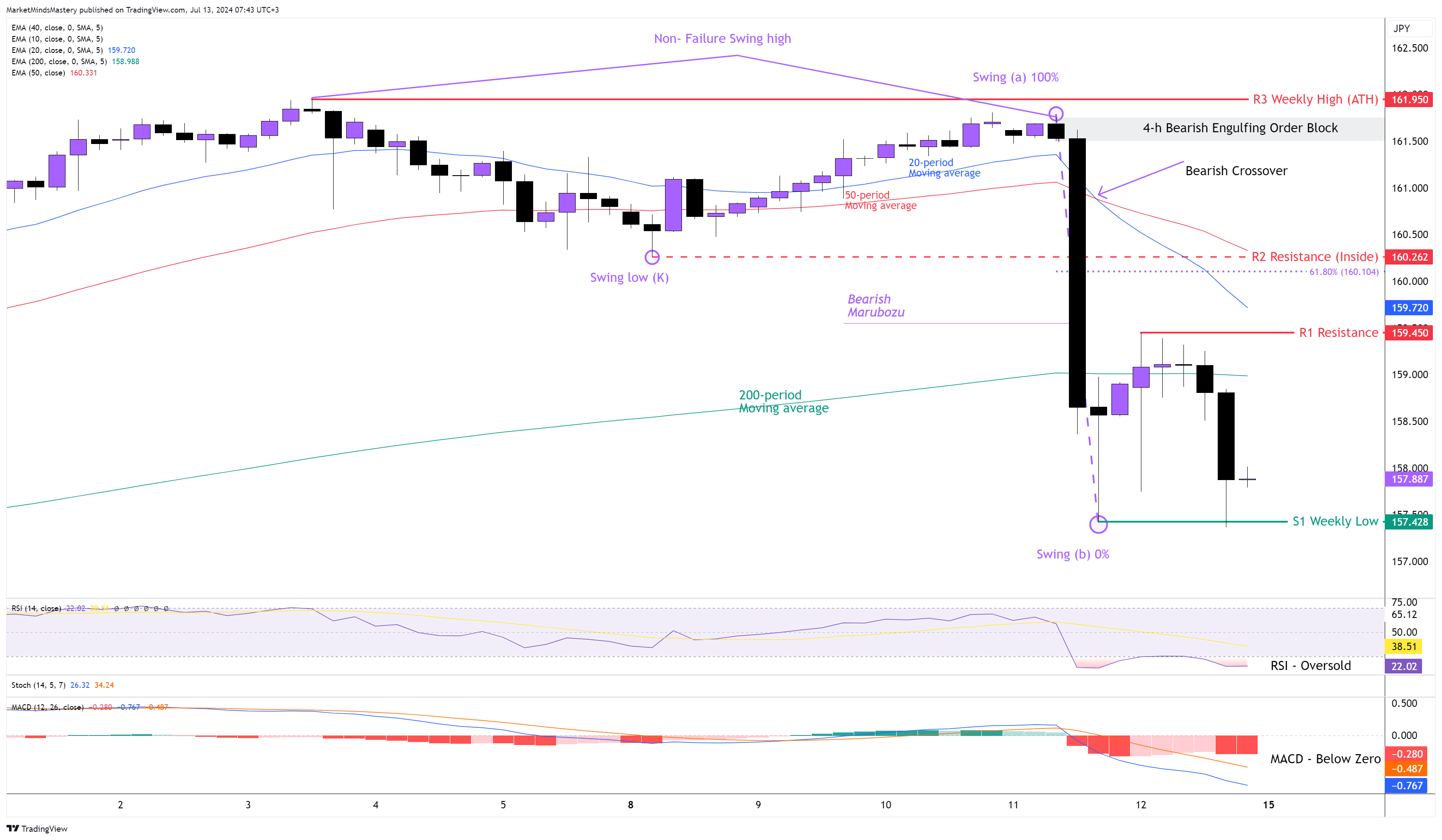في أعقاب توقعات السوق الأسبوع الماضي، تسببت شمعة الدوجي على الرسم البياني الأسبوعي في انخفاض السعر بحوالي 300 نقطة تقريبًا خلال إعلان مؤشر أسعار المستهلكين في الولايات المتحدة. لا يزال الرسم البياني الأسبوعي في اتجاه صعودي قوي، وقد أدى انخفاض السعر الأسبوع الماضي إلى دخول السوق في مرحلة تصحيحية أو ارتدادية. على الرسم البياني للأربع ساعات، أنشأ السعر شمعة ماروبوزو الهبوطية التي اخترقت قاع التأرجح عند (K) وتسببت في ارتفاع التأرجح عند أعلى مستوى على الإطلاق عند (ATH) حوالي 162. وبالإضافة إلى ذلك، اخترقت الشمعة نفسها المتوسط المتحرك لـ 200 فترة، وأغلق السعر تحته، وهذا يشير إلى حركة هبوطية قوية. وتجاوزت شمعة الـ20 فترة دون المتوسط المتحرك لـ50 فترة، وهو أمر هابط. قام السعر بتكوين قمم منخفضة وقيعان منخفضة، مما يشير إلى بداية الاتجاه الهابط على مخطط 4 ساعات. يقع مؤشر القوة النسبية تحت منطقة 30، مما يجعل المذبذب ذروة البيع، وهذا له آثار هبوطية. مؤشر MACD تحت الصفر ولديه هيستوجرام هابط، كما هو موضح على الرسم البياني، وهي أيضًا إشارة هبوطية. وابتداءً من يوم الإثنين، إذا استمر السعر في حركته الهبوطية، ستكون منطقة الدعم الأولى، S1، حول مستوى 157.428، وهو أدنى مستوى في الأسبوع السابق. وإذا استمر الاتجاه الهبوطي على مدار 4 ساعات، يجب أن يخترق السعر ويغلق تحت S1. وإذا حدث ذلك، ستكون منطقة الدعم التالية هي منطقة الدعم 155.720، وهو مستوى السعر المنخفض الأسبوعي الأقدم.