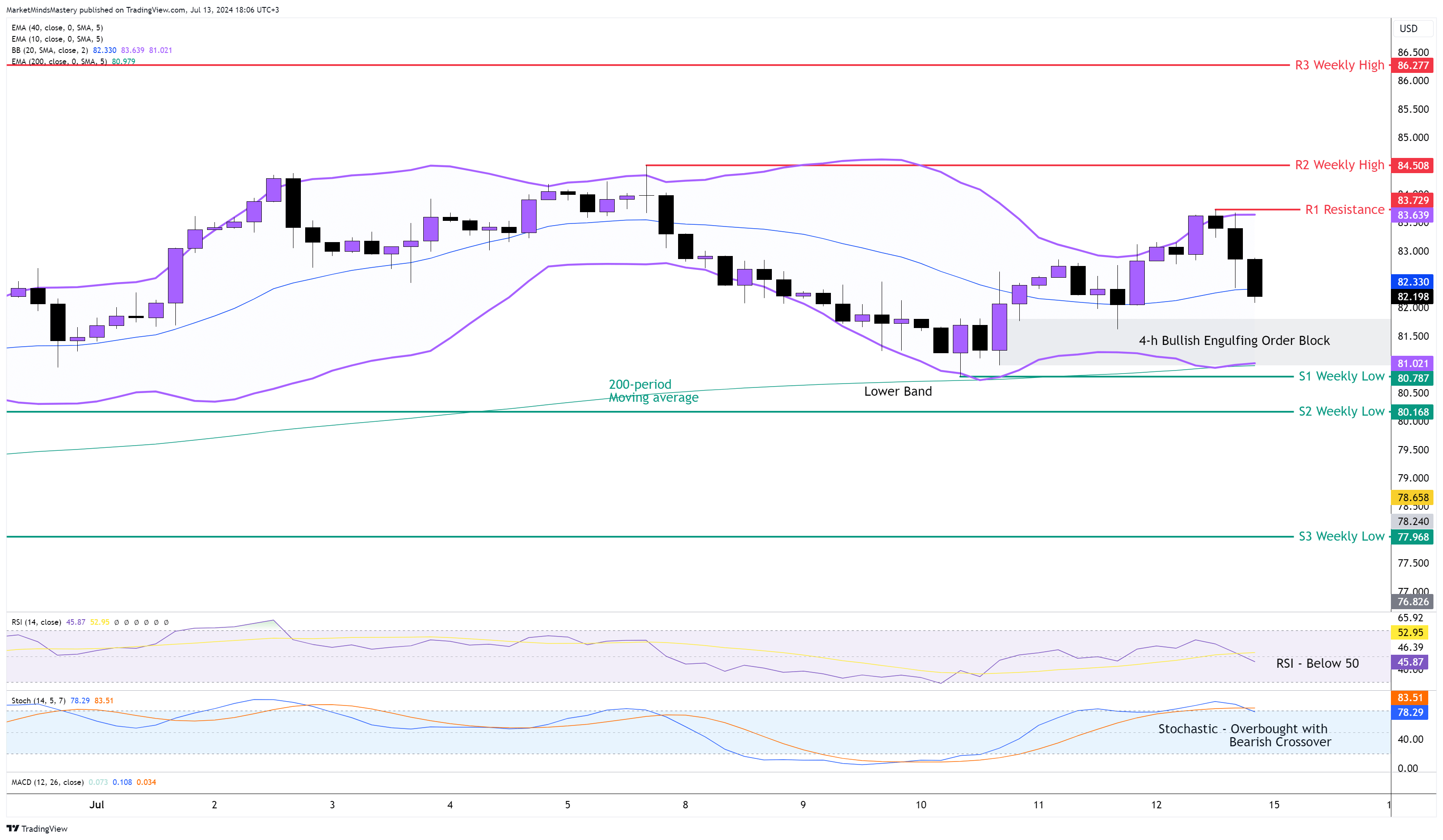 بعد السلسلة الناجحة من "القمم المرتفعة والقيعان المرتفعة" على شموع الرسم البياني الأسبوعي، انتهى السعر الأسبوع الماضي على شكل شمعة "هبوطية"، لكنه ظل فوق المتوسطات المتحركة الأسبوعية. على الرغم من أننا نعرض الرسم البياني الأسبوعي على هذا الرسم البياني للسوق، إلا أن المتوسطات المتحركة الأسبوعية خلقت تقاطعًا صعوديًا. على الرسم البياني للأربع ساعات، فإن مؤشر القوة النسبية RSI أقل من 50، مما يشير إلى الاتجاه الهابط. أنشأ مؤشر ستوكاستيك تقاطعًا هبوطيًا بعد أن أصبح مؤشر ستوكاستيك Oscillator تقاطعًا هبوطيًا بعد أن أصبح في منطقة "أوفربيد الشراء"، وهو ما ينطوي على آثار هبوطية. يمكن أن يتسبب هذا الإجراء في دخول السعر في مرحلة تصحيحية. حاليًا، يتم تداول السعر حاليًا داخل النطاقين الأعلى والأسفل من مؤشر بولينجر باند. في يوم الجمعة، أغلق السعر يوم الجمعة دون الحد الأوسط لمؤشر بولينجر باند، والذي يمثل 20 فترة المتوسط المتحرك . إذا استمر السعر في التحرك لأسفل، فإن الدعم الأول هو S1، والذي سيكون 80.78 دولارًا، وهو أدنى مستوى في الأسبوع السابق. عند هذا المستوى، تتشكل كتلة أوامر الابتلاع الصاعدة، ويمكن أن تكون بمثابة عامل دعم إضافي للسعر. إذا أغلق السعر تحت S1 ؛ واستمر في الانخفاض، فإن منطقة الدعم التالية، S2، ستكون عند أدنى مستوى أسبوعي أقدم عند حوالي 80.16 دولار.