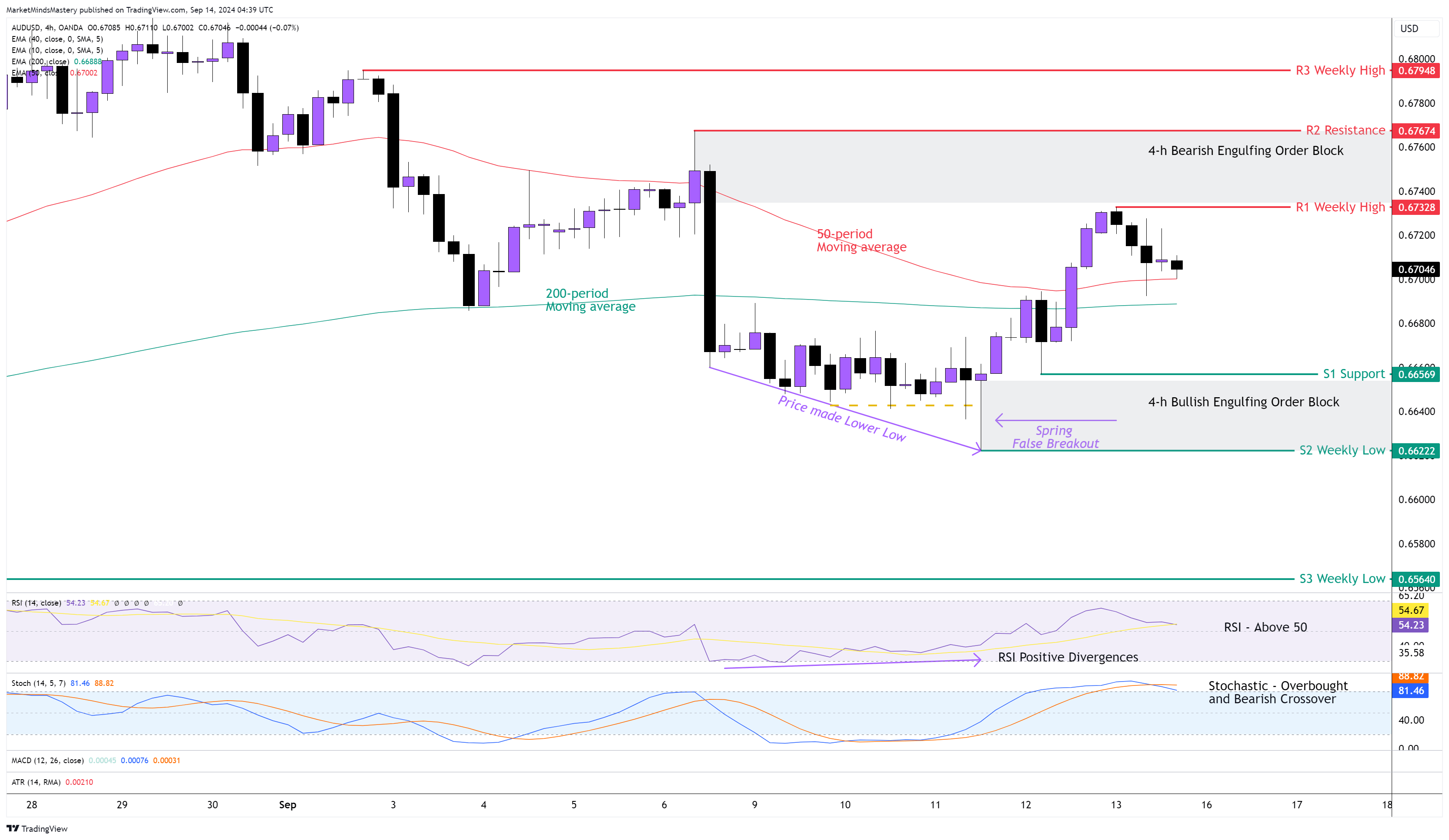خلقت حركة السعر في نهاية الأسبوع السابق نمط الشموع الصعودية على الرسم البياني الأسبوعي. لا يزال الرسم البياني الأسبوعي في نطاق تداول. على الرسم البياني للأربع ساعات، أنشأ السعر تشكيل قاع منخفض يوم الأربعاء الماضي، ولكن نمط الرسم البياني الربيعي تسبب في تحرك السعر للأسفل مؤقتًا، مما أدى إلى حدوث اختراق كاذب. بعد ذلك، ارتد السعر وتحرك صعودًا إلى أن ظهرت كتلة الأوامر الهابطة التي أشرنا إليها في توقعات السوق الأسبوع الماضي. وتسبب ذلك في أن يظهر مؤشر القوة النسبية RSI Oscillator تباعدًا إيجابيًا أو صعوديًا من الفئة A'. حاليًا، يقع مؤشر القوة النسبية فوق خط الوسط 50، مما يشير إلى الاتجاه الصعودي. يقع مؤشر ستوكاستيك مؤشر ستوكاستيك المتذبذب في حالة أوفر شراء، وهو مؤشر على قوة السعر في زوج العملات AUDUSD. وفي الوقت نفسه، عبر خط %K (الأزرق) أسفل خط %D (البرتقالي) بينما يقع مؤشر التذبذب في حالة Ovebough، وهذا له آثار هبوطية، على الأقل مؤقتًا. يقع المتوسط المتحرك لـ 50 فترة فوق المتوسط المتحرك لـ 200 فترة، وهذا أمر صعودي.