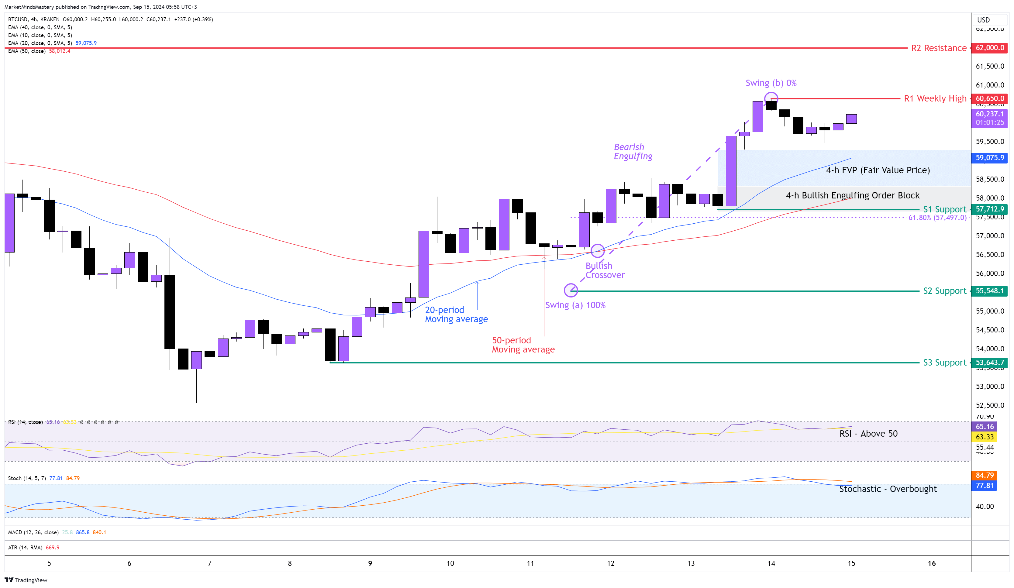إذا اخترق السعر دعم S1 واستمر في الانخفاض، فإن منطقة الدعم التالية، S2، ستكون حول 55548 دولارًا. في حال اخترق السعر دعم S2 واستمر في التحرك لأسفل، ستكون منطقة الدعم التالية، S3، حوالي 53643 دولارًا. وعلى العكس من ذلك، إذا تحرك السعر لأعلى، فإن منطقة المقاومة الأولى، R1، ستكون حول 60650 دولارًا، وهي قمة الأسبوع السابق. إذا اخترق السعر مستوى R1 واستمر في التحرك لأعلى، فستكون منطقة المقاومة التالية، R2، حول 62000 دولار.