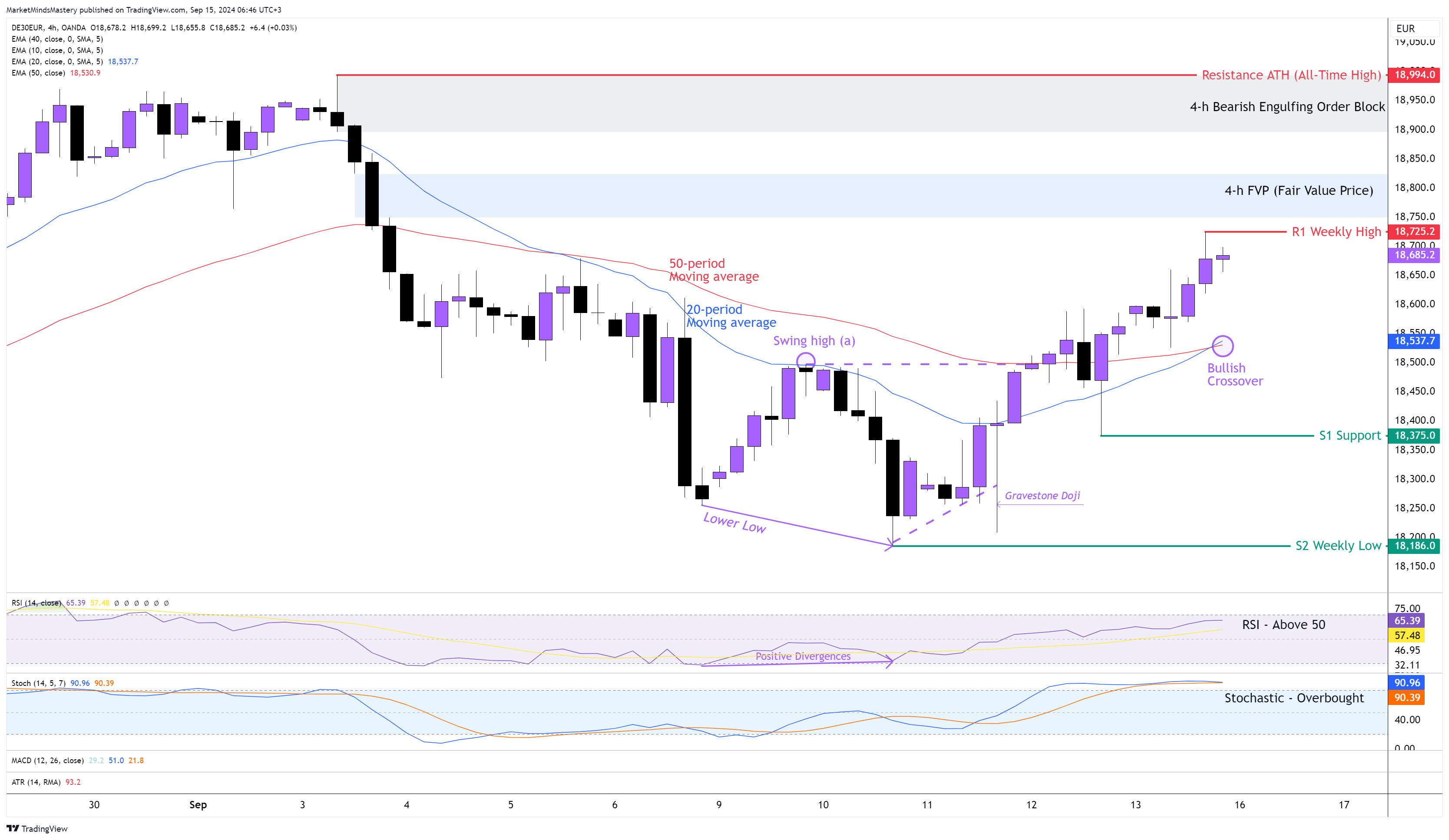 من ناحية أخرى، إذا انخفض السعر وتحرك للأسفل، فإن منطقة الدعم الأولى، S1، ستكون حول 18375. إذا اخترق السعر S1 واستمر في الانخفاض، فإن منطقة الدعم التالية، S2، ستكون قاع الأسبوع السابق، حوالي 18186.