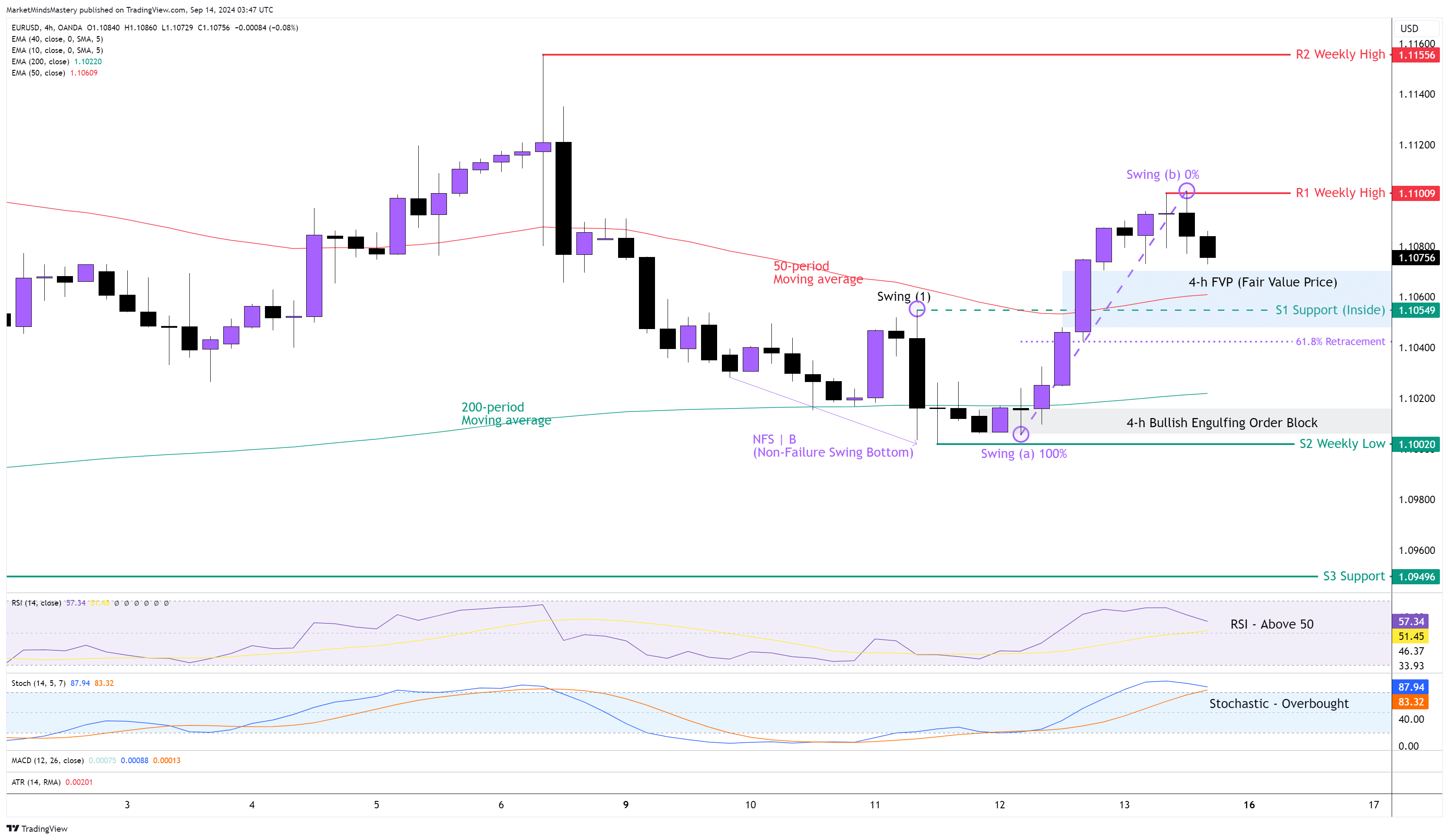 بعد حركة السعر الهابطة التي بدأت يوم الاثنين الماضي، أنشأ السعر يوم الأربعاء قاع تأرجح غير فاشل (قاع التأرجح غير الفاشل). ثم اخترق بعد ذلك قمة التأرجح عند (1)، كما نظهر على الرسم البياني أعلاه، مما أدى إلى خلق قمة أعلى. الرسم البياني الأسبوعي في اتجاه صاعد، وفقًا لتحليل التأرجح، حيث يحافظ على تشكيل القمة المرتفعة والقاع المرتفع. تكتمل حركة السعر على الرسم البياني الأسبوعي على شكل شمعة ذات جسم صغير و فتيل طويل منخفض، والذي عادة ما يكون له آثار صعودية. يقع مؤشر فوق المتوسط المتحرك لـ 200 فترة، وهذا له آثار صعودية. مؤشر RSI المؤشر المتذبذب فوق مستوى 50، مما يشير إلى الاتجاه الصعودي. وبالإضافة إلى ذلك، فإن مؤشر ستوكاستيك مؤشر ستوكاستيك في منطقة ذروة الشراء، وهو أمر صعودي أيضًا. يوم الخميس الماضي، أنشأ السعر يوم الخميس الماضي كتلة أوامر صاعدة مبتلعة على الرسم البياني لفترة 4 ساعات حول 1.10 و سعر القيمة العادلة حول 1.1060.