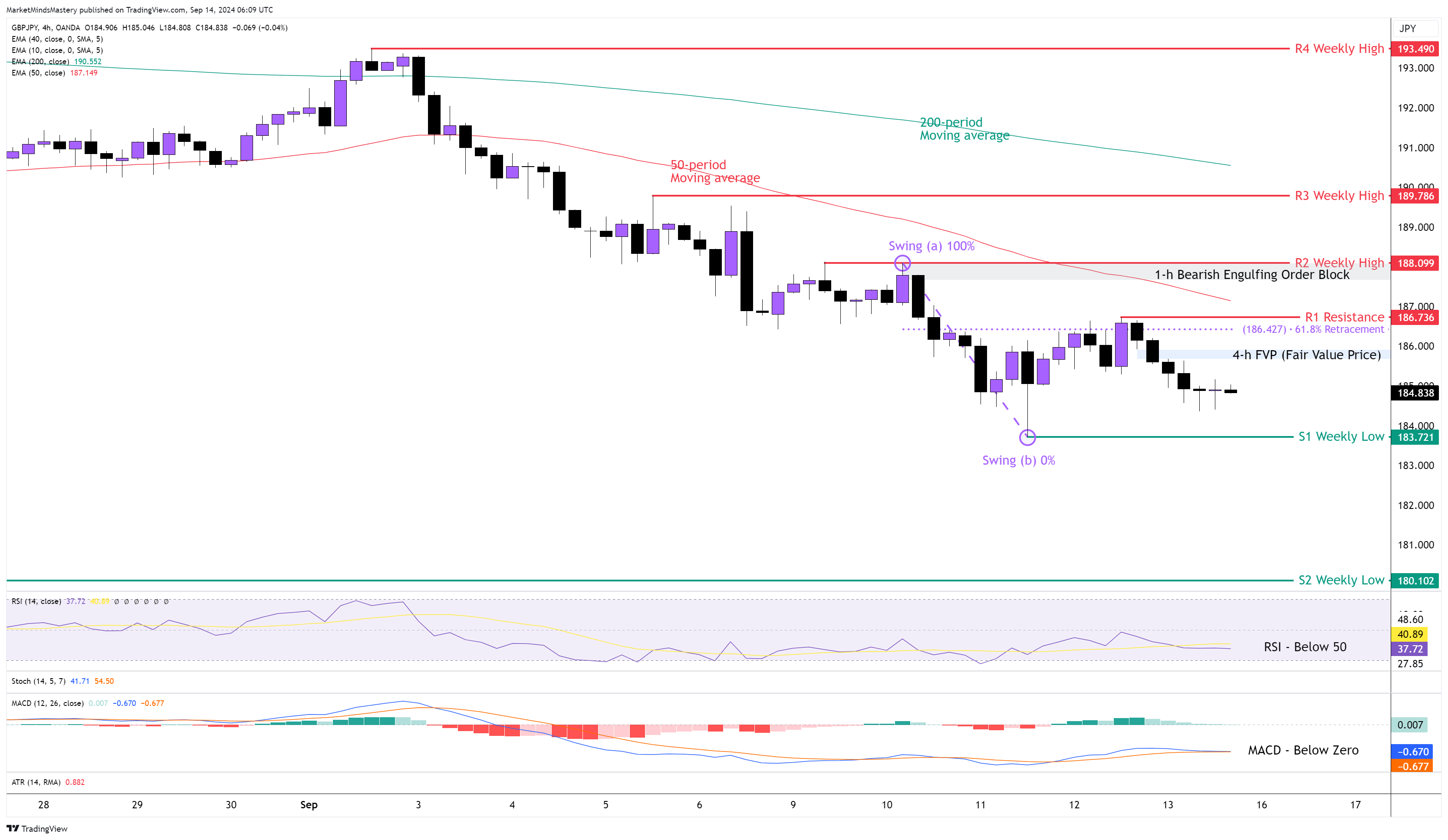 بعد حركة السعر في الأسبوع الماضي، والتي كانت عبارة عن ابتلاع هابط، تابع السعر حركته واستمر السعر في التحرك لأسفل. على الرسم البياني للأربع ساعات، حافظ السعر على تشكيل القمم المنخفضة والقيعان المنخفضة ، ويظهر الاتجاه الهابط بوضوح في هذا الإطار الزمني. يقع المتوسط المتحرك لـ 50 فترة تحت المتوسط المتحرك لـ ، وهذا أمر هبوطي. يقع مؤشر القوة النسبية RSI Oscillator تحت خط الوسط 50، وهذا له آثار هبوطية. يقع مؤشر MACD تحت خط الصفر، وهذا ينطوي على دلالات هبوطية. كلا خطي الماكد، خط الإشارة (البرتقالي) وخط مسطحان، يلامس كل منهما الآخر، وهذا يدل على أن الأسعار لم تقم بحركة اتجاهية في الفترات القليلة الماضية على الرسم البياني للأربع ساعات. يوم الثلاثاء الماضي، تم إنشاء كتلة أوامر الابتلاع الهابطة حول مستوى السعر 188.00 على الرسم البياني للساعة. وبالإضافة إلى ذلك، يوم الخميس الماضي، تم إنشاء FVP (سعر القيمة العادلة) حول منطقة 186.00.