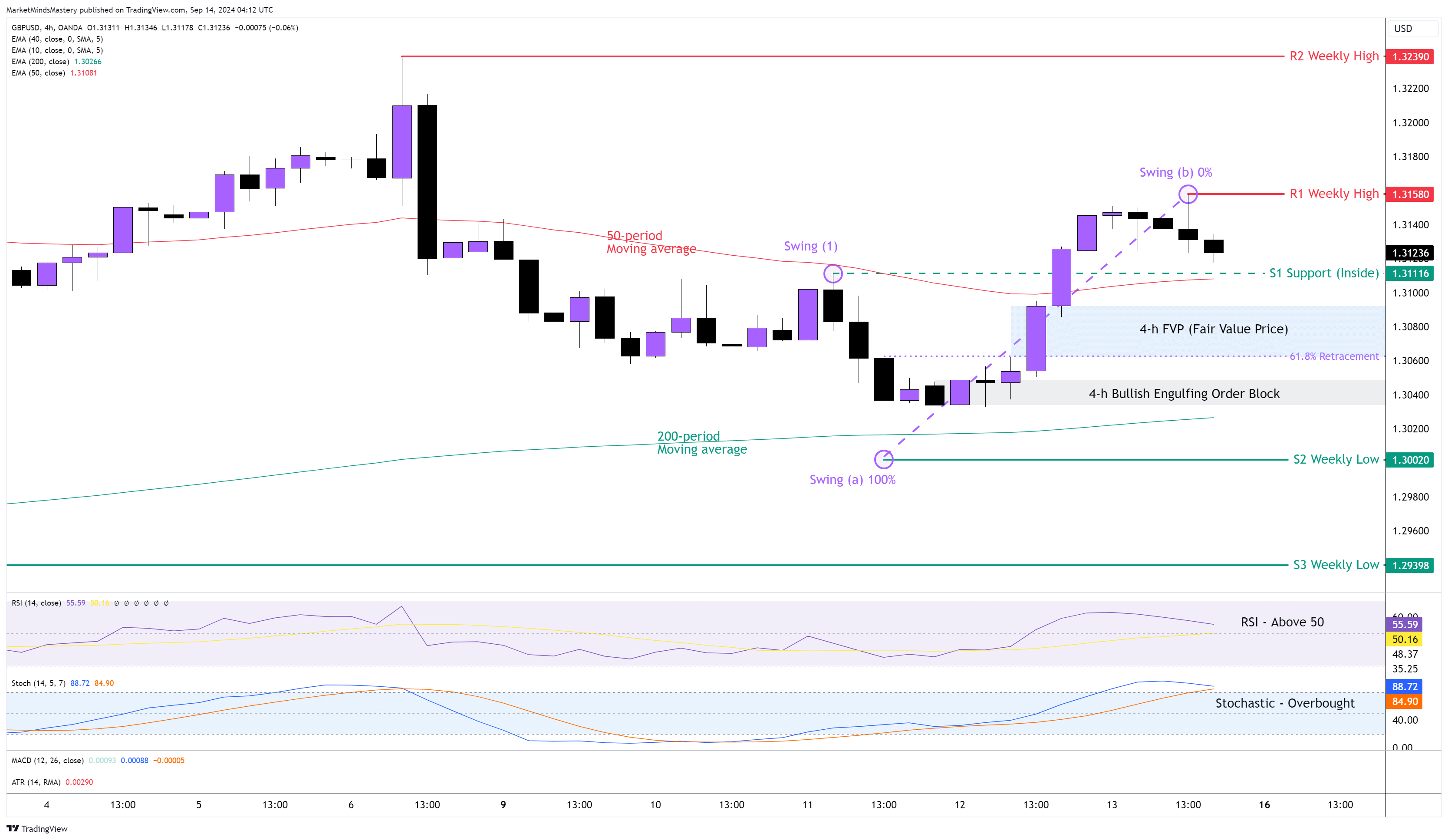 كان أداء الجنيه الإسترليني جيدًا في السوق الأسبوع الماضي. يُظهر الرسم البياني الأسبوعي اتجاهًا صعوديًا حيث يحافظ السعر على سلسلة من القمم المرتفعة والقيعان المنخفضة، وكذلك لأن فترة 10 فترات فوق المتوسط المتحرك لـ 40 فترة (غير موضح على الرسم البياني أعلاه). تُظهر حركة السعر الأسبوعية حركة سعرية أسبوعية تُظهر نمط "اليعسوب". وله آثار صعودية لأنه يأتي في سياق سوق صاعد. أنشأ السعر في زوج العملات GBPUSD هيكل جديد للسوق على الرسم البياني لفترة 4 ساعات. في الأسبوع الماضي، اخترق السعر التأرجح عند النقطة (1) وخلق قمة جديدة. ويقع المتوسط المتحرك لـ <قوي>50 فترة فوق المتوسط المتحرك لـ <قوي>200 فترة، وهذا له آثار صعودية. كما أن السعر أغلق أيضًا فوق المتوسط المتحرك لـ 50 فترة، مما يشير إلى الاتجاه الصعودي. مؤشر RSI فوق خط الوسط 50، وهذا أمر صعودي. يقع مؤشر ستوكاستيك مؤشر ستوكاستيك في حالة أوفر بوي، مما يشير إلى القوة الصعودية في حركة سعر العملة. وابتداءً من يوم الإثنين، إذا استمر السعر في التحرك لأسفل، ستكون منطقة الدعم الأولى، S1، منطقة دعم داخلية عند مستوى 1.3111 تقريبًا. ويقع هذا عند نفس مستوى المتوسط المتحرك لـ 50 فترة. إذا انخفض السعر أكثر من ذلك، فقد يملأ منطقة FVP (سعر القيمة العادلة) حول 1.3080. ويقع حول 1.3060 حول منطقة النسبة الذهبية 61.8% من تصحيح فيبوناتشي، والتي يمكن أن تصبح مستوى دعم. إذا استمر السعر في التحرك لأسفل، فهناك كتلة أمر الابتلاع الصعودي حول مستوى 1.3040. وفي حالة استمرار الحركة الهبوطية سيجد السعر منطقة الدعم التالية، S2، حول مستوى 1.300، وهو أدنى مستوى في الأسبوع السابق. وعلى العكس من ذلك، إذا ارتد السعر وتحرك لأعلى، سيجد السعر منطقة المقاومة الأولى، R1، حول 1.3158، وهي قمة الأسبوع السابق. إذا استمر السعر في حركته الصاعدة وأغلق فوق R1 وتحرك لأعلى، فإن منطقة المقاومة التالية، R2، ستصبح منطقة المقاومة التالية، R2، هي قمة الأسبوع السابق عند 1.323390 تقريبًا.