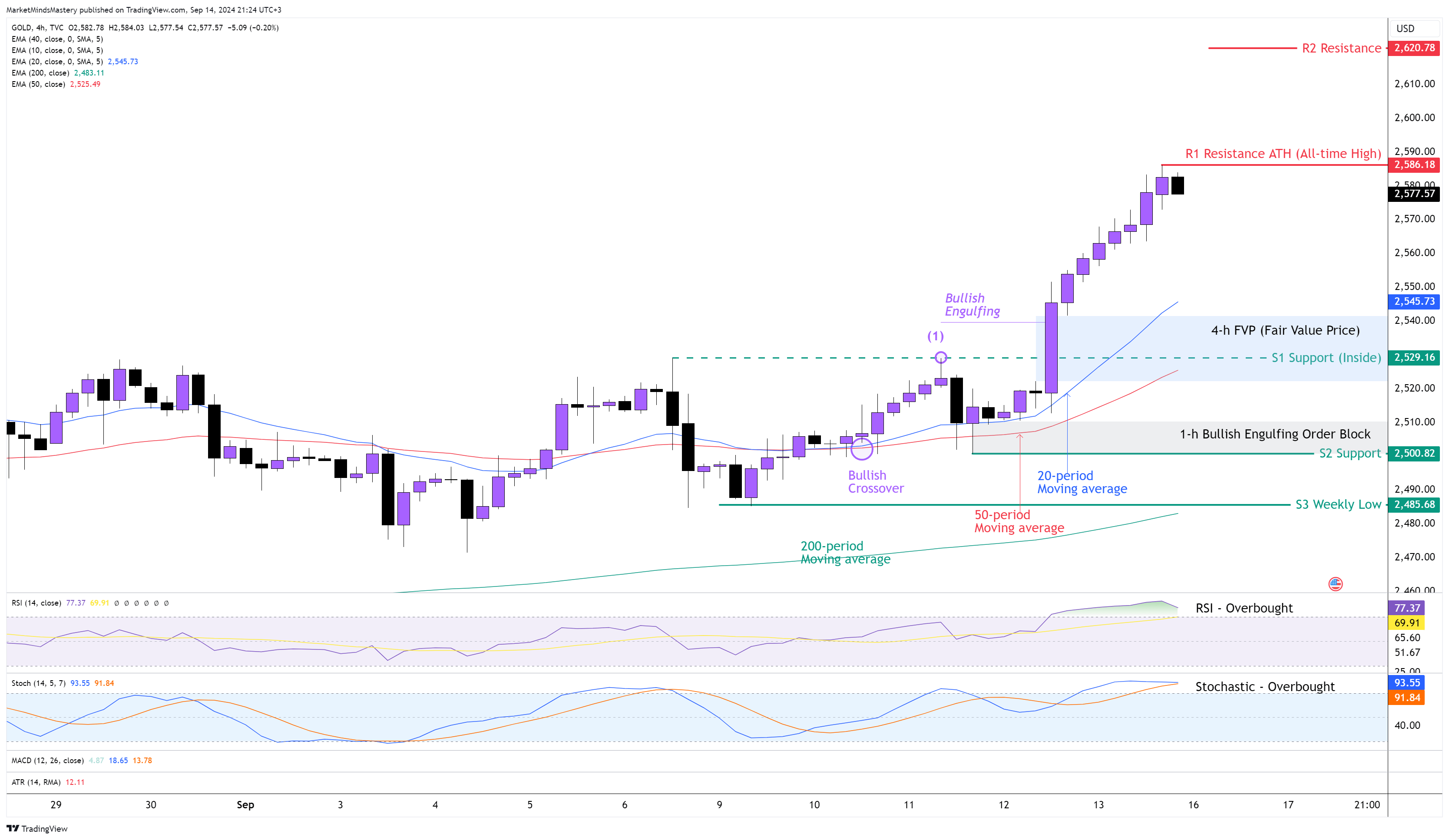 بعد الأسابيع الثلاثة الأخيرة من تماسك الأسعار، خلق السعر اختراقًا صعوديًا، مما أبقى على الاتجاه الصعودي الرئيسي ساريًا. على الرسم البياني للأربع ساعات، أنشأ السعر سلسلة من "القمم المرتفعة والقيعان المرتفعة". في يوم الثلاثاء الماضي، عبر المتوسط المتحرك لفترة 20 يوم الثلاثاء الماضي فوق المتوسط المتحرك لفترة 50 يوم، والمعروف باسم "التقاطع الصعودي"، وهذا له آثار صعودية. وصل خط المؤشر المتحرك للرسوم المتحركة إلى الرقم 70، مما يعني أن المذبذب في حالة إفراط في الشراء، وهذا أمر صعودي. وبالإضافة إلى ذلك، فإن مؤشر ستوكاستيك مؤشر التذبذب في حالة إفراط في الشراء حيث أنه يعبر فوق الحد الأعلى له، وهو 80. نظرًا لأن الذهب سجل سعرًا جديدًا ATH (أعلى سعر على الإطلاق) يبلغ حوالي 2586 دولارًا أمريكيًا إذا استمر السعر من يوم الاثنين فصاعدًا في التحرك صعودًا، فقد تكون المقاومة التالية حوالي 2620 دولارًا، وهذا يعتمد على ATR (متوسط المدى الحقيقي). وفي حالة تحرك السعر للأسفل ليدخل في مرحلة تصحيحية، فإن منطقة الدعم الأولى، S1، ستكون منطقة الدعم الأولى S1 هي مستوى الدعم الداخلي الداخلي عند حوالي 2529 دولارًا. يعتبر هذا المستوى مستوى دعم رئيسي لأنه يتعايش مع قمة التأرجح الأخيرة، كما هو موضح في النقطة (1)، والمتوسط المتحرك لـ 50 فترة، ومنتصف شمعة الابتلاع الصعودي، و (سعر القيمة العادلة) الذي تم إنشاؤه يوم الخميس الماضي. في حالة اختراق السعر لمستوى S1، واستمراره في التحرك لأسفل، فإن منطقة الدعم التالية، S2، ستكون حول مستوى 2500 دولار. عند هذا المستوى السعري، تم إنشاء مجموعة أوامر الابتلاع الصعودية يوم الأربعاء الماضي، ويمكن أن تصبح منطقة دعم إضافية للسعر.