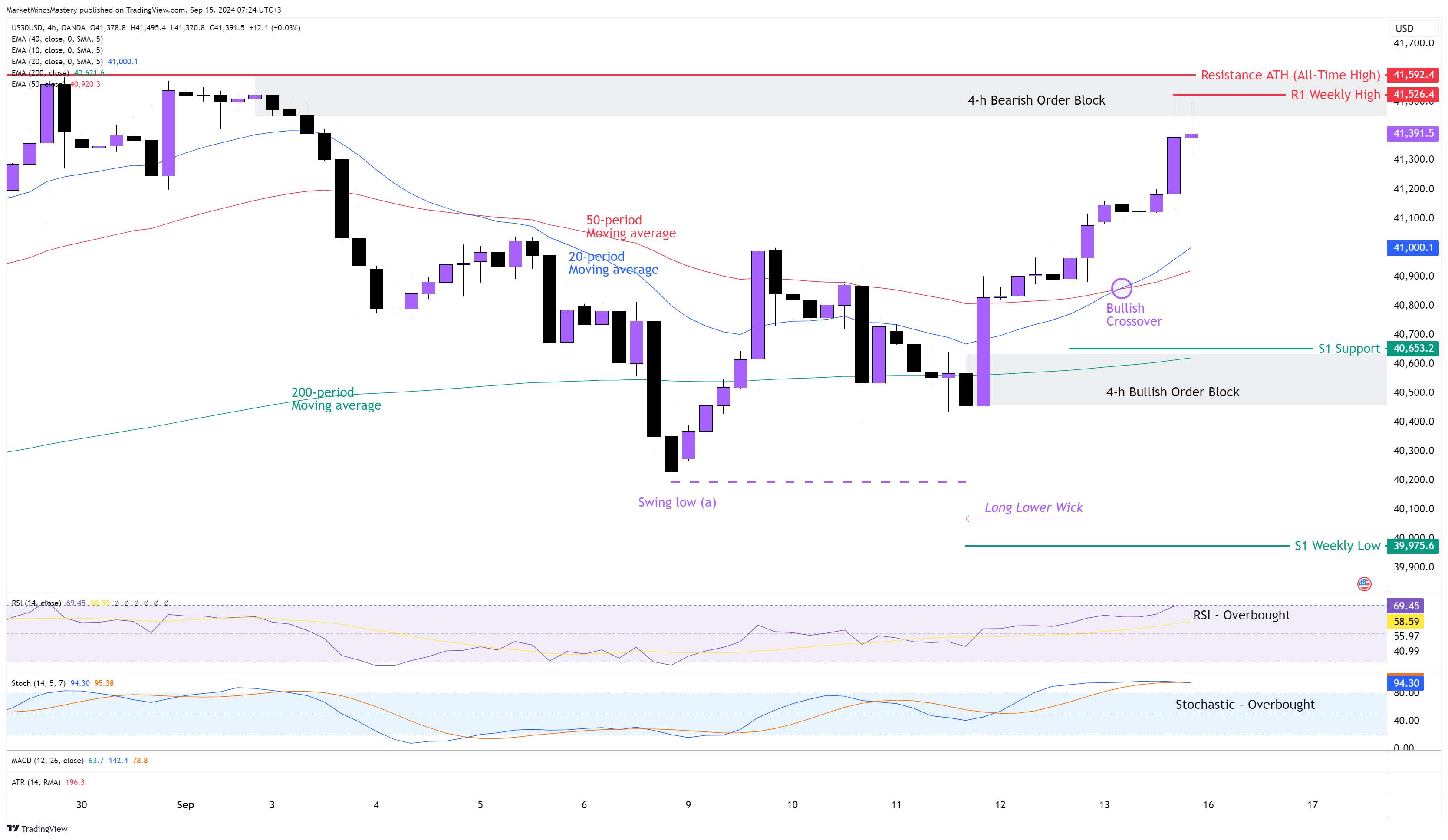 ارتفع سعر US30 الأسبوع الماضي، وكاد أن يصل إلى أعلى مستوى له على الإطلاق عند حوالي 41592 دولارًا أمريكيًا. تسببت كتلة الأوامر الهابطة التي حددناها على الرسم البياني الأسبوع الماضي، حول 41500 دولار، في توقف السعر عن التحرك صعودًا يوم الجمعة الماضي. ومع ذلك، انتهى الرسم البياني الأسبوعي بـ الأسبوعي على شكل صعودي . حدث التغير في هيكل السوق يوم الأربعاء الماضي بمجرد أن اختبر السعر قاع التأرجح عند النقطة (أ) حول 40200 دولار أمريكي، وبنهاية جلسة التداول، قام السعر بطباعة شمعة ذات فتيل سفلي طويل، وهو ما له آثار صعودية بشكل عام. بالإضافة إلى ذلك، في نفس اليوم، أنشأ السعر في نفس اليوم كتلة أوامر صاعدة لمدة 4 ساعات عند حوالي 40500 دولار. وصل كل من مؤشري التذبذب، مؤشر القوة النسبية ومؤشر ستوكاستيك إلى حالة أوفر شراء، وهذه لها آثار صعودية.