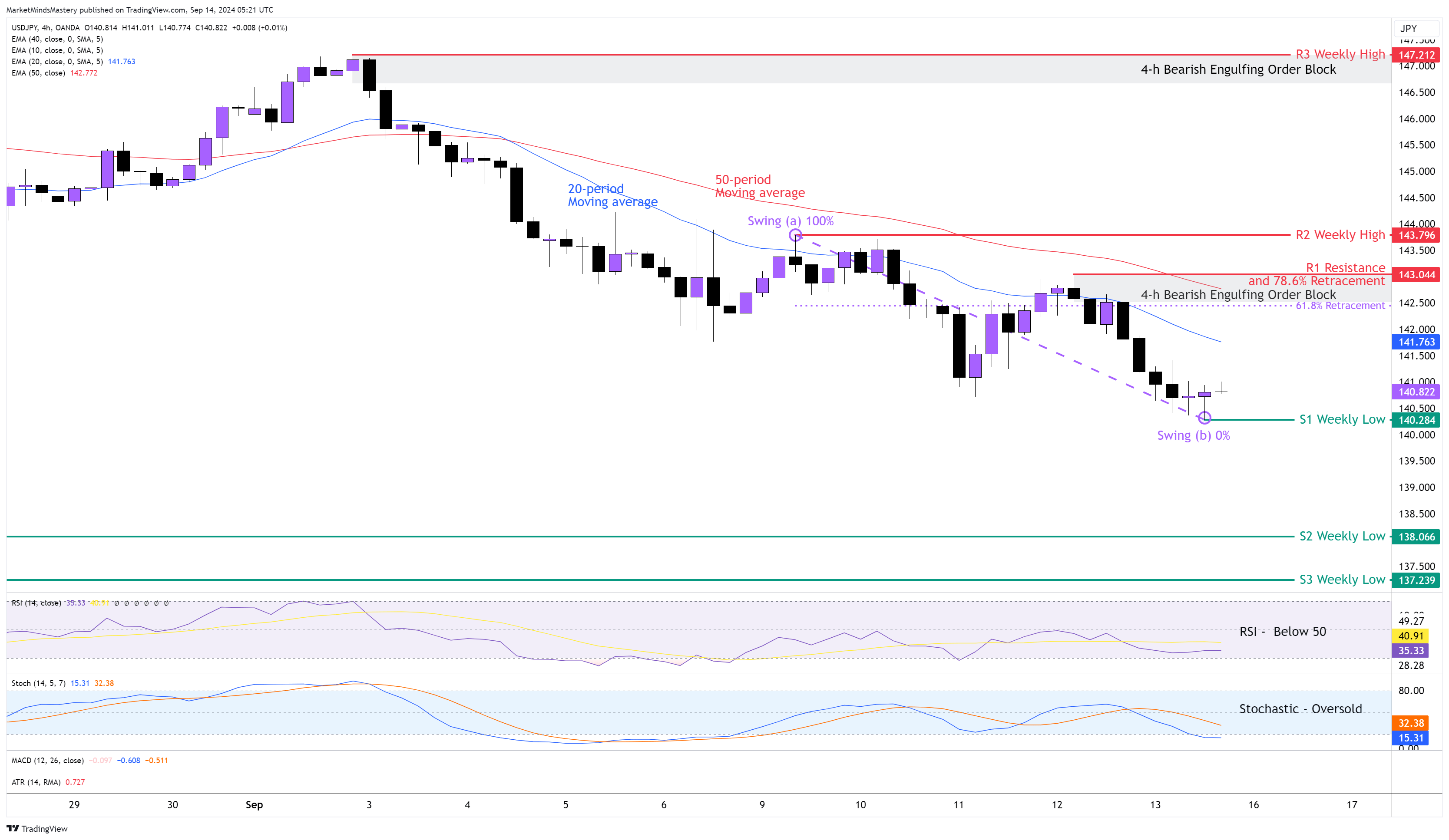 بعد الانخفاض المستمر الذي شهده زوج العملات USDJPY الأسبوع الماضي، استمر السعر في التحرك هبوطيًا. وقد لعب نموذج الشموع الهابطة الذي شرحناه في توقعات السوق الأسبوع الماضي بشكل جيد وأجبر السعر على الرسم البياني للأربع ساعات على إنشاء سلسلة جديدة من القمم المنخفضة والقيعان المنخفضة. يقع المتوسط المتحرك لـ تحت المتوسط المتحرك لـ ، وهذا أمر هبوطي. يقع مؤشر القوة النسبية تحت خط الوسط 50، مما يشير إلى الاتجاه الهابط. يقع مؤشر ستوكاستيك Stochastic Oscillator في حالة Oversold، وهذا هبوطي. نظرًا لأن السعر في اتجاه هابط، وكان يوم الجمعة الماضي قاع تأرجح مؤكد عند النقطة (ب)، يمكننا استخدام أداة فيبوناتشي Retracement لتقدير مستوى الارتداد إذا استمر اتجاه زوج العملة الهابط. فابتداءً من يوم الاثنين، إذا دخل السعر في مرحلة ارتداد وتحرك لأعلى، فإن منطقة المقاومة الأولى، R1، ستكون 143.044 تقريبًا. يتعايش هذا المستوى مع مستويات تصحيح فيبوناتشي بين مستويات تصحيح فيبوناتشي بين مستوى 61.8% و 78.6% والمتوسط المتحرك لـ 50 فترة والمتوسط المتحرك لـ 4 ساعات كتلة الأوامر الهبوطية. في حال اخترق السعر R1 واستمر في التحرك لأعلى، فإن منطقة المقاومة التالية R2، ستكون منطقة المقاومة التالية R2، هي قمة الأسبوع السابق، حول 143.796. إذا اخترق السعر منطقة المقاومة R2، سينتهي الاتجاه الهبوطي. وعلى العكس من ذلك، إذا استمر السعر في الاتجاه الهبوطي، ستكون منطقة الدعم الأولى، S1، حول 140.28، وهي قاع الأسبوع السابق. إذا تحرك السعر دون دعم S1، فإن منطقة الدعم التالية، S2، ستكون منطقة الدعم التالية S2 هي مستوى السعر المنخفض الأسبوعي الأقدم حول 138.066.