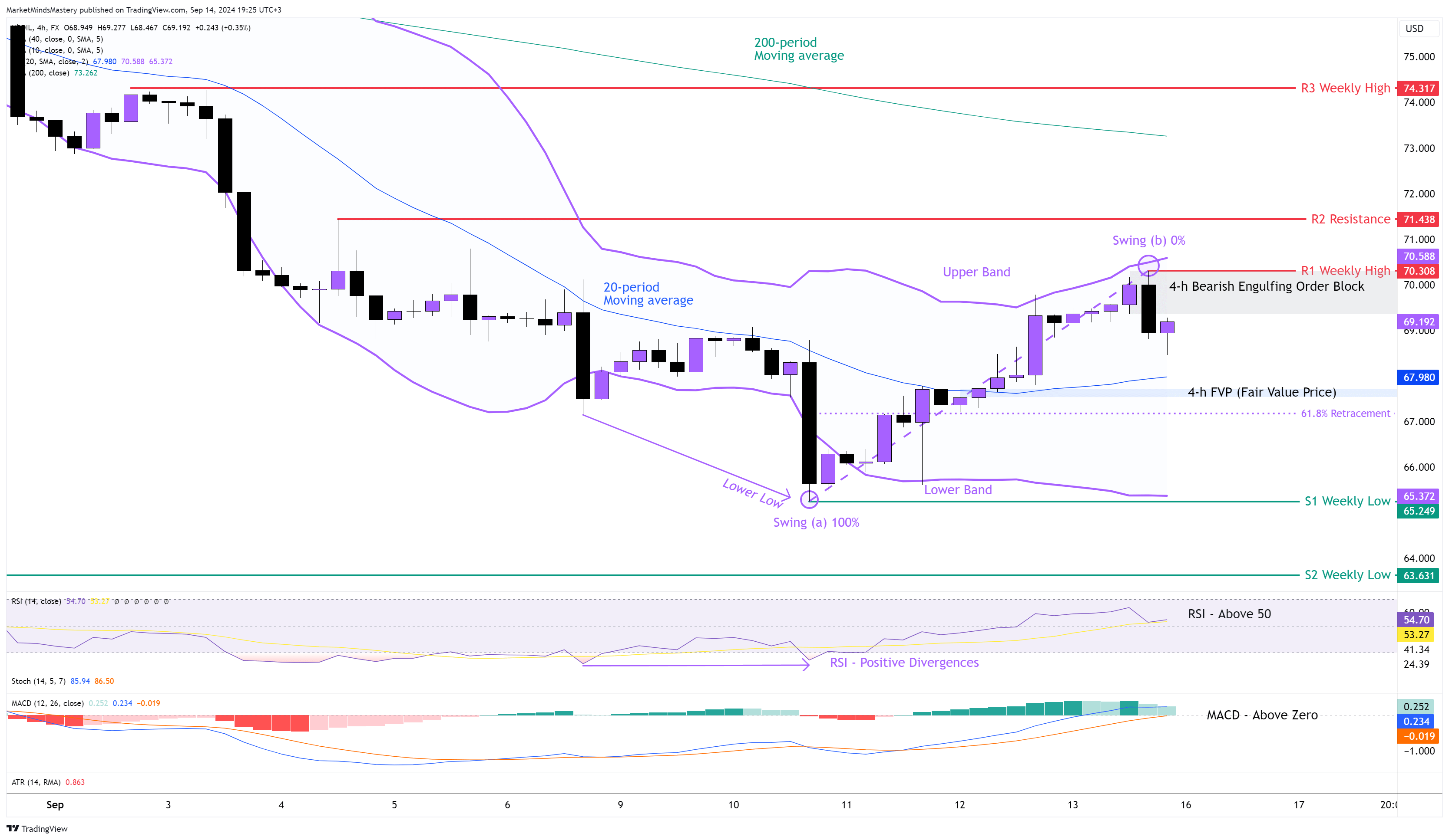 في يوم الجمعة الماضي، تم تحديد سعر 4 ساعات من كتلة أوامر الابتلاع الهبوطية عند حوالي 70.00 دولارًا. كان مؤشر القوة النسبية فوق مستوى 50، مما يشير إلى الاتجاه الصعودي. عبر مؤشر الماكد فوق خط الصفر، مما يشير إلى الاتجاه الصعودي. يقع مؤشر MACD الماكد فوق خط الصفر، مما يشير إلى ارتفاع الأسعار. باستخدام مؤشر بولينجر باند، فإن السعر حاليًا حول الحد الأعلى للنطاق العلوي. لذلك، إذا تحرك السعر لأعلى، فإن أعلى مستوى للأسبوع السابق سيكون أول مقاومة R1، حوالي 70.38 دولارًا. إذا اخترق السعر مقاومة R1 واستمر في الارتفاع، فإن منطقة المقاومة التالية، R2، ستكون حول 71.43 دولارًا تقريبًا. أي حركة صعودية أخرى ستجد منطقة المقاومة التالية، R3، عند 74.31 دولارًا.