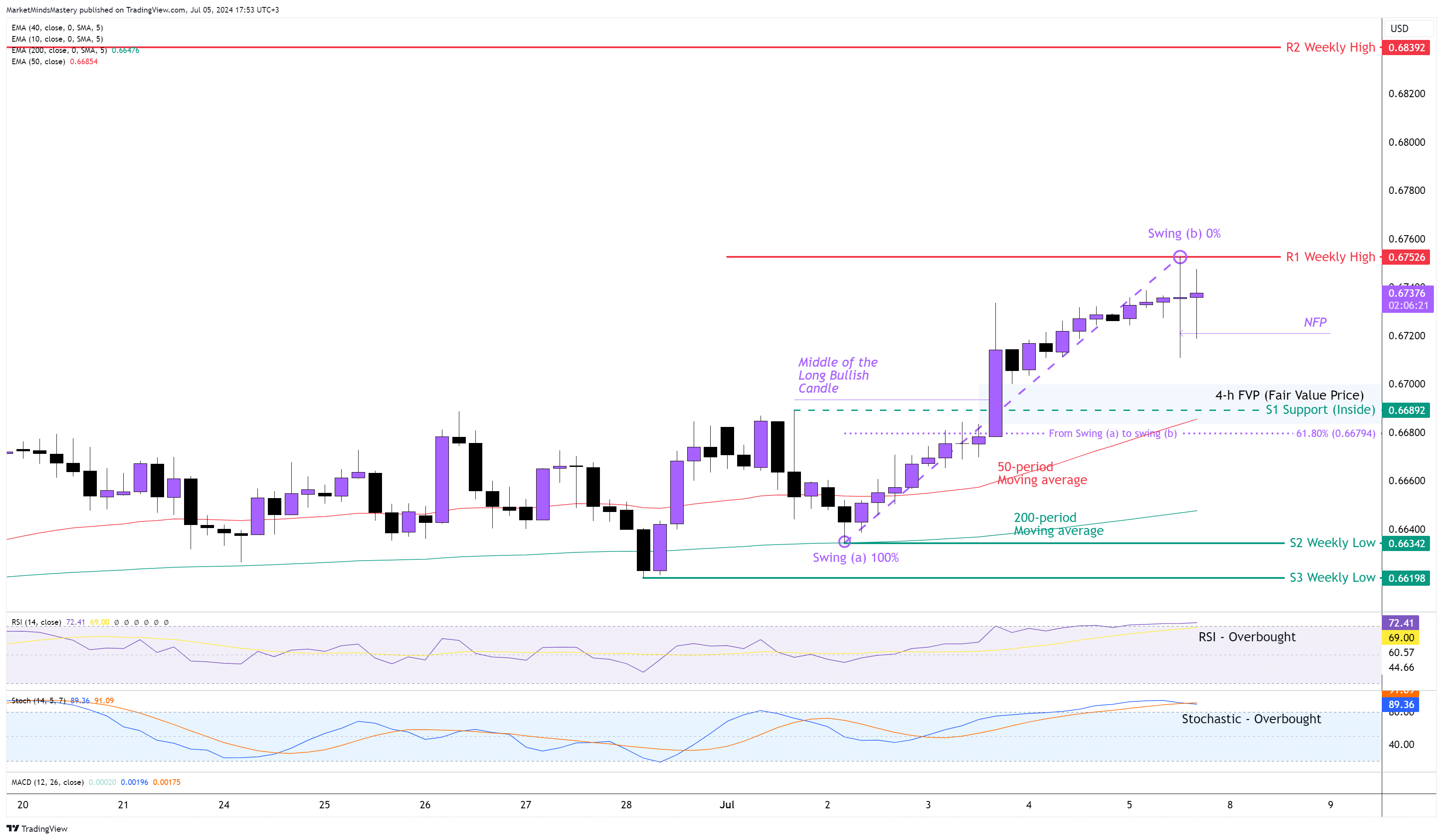 إذا تحرك السعر لأعلى، فستكون منطقة المقاومة الأولى، R1، هي قمة الأسبوع السابق، حوالي 0.67526. إذا اخترق السعر R1 وواصل التحرك لأعلى، فإن منطقة المقاومة التالية، R2، تقع حول ؛ 900 نقطة (90 نقطة) عند 0.68392. منطقة R2 هي قمة أسبوعية قديمة. وعلى العكس من ذلك، إذا انخفض السعر وتحرك للأسفل، فإن منطقة الدعم الأولى، S1، ستكون منطقة الدعم الأولى S1 هي منطقة دعم داخلي عند حوالي 0.66800. يعتبر هذا مستوى سعر مهم  لأنه يتكون من بعض المؤشرات المختلفة التي يمكن أن توفر جميعًا دعمًا للسعر. وهذه المؤشرات هي نسبة فيبوناتشي الذهبية 61.8%، وهي المتوسط المتحرك لـ 50 فترة، ومنتصف سعر القيمة العادلة.وفي حالة عدم عثور السعر على الدعم وانخفاضه أكثر، ستكون منطقة الدعم التالية، S2، هي أدنى مستوى للأسبوع السابق، حول 0.66342، والدعم التالي، S3، وهو قاع أسبوعي آخر، حول 0.66198.