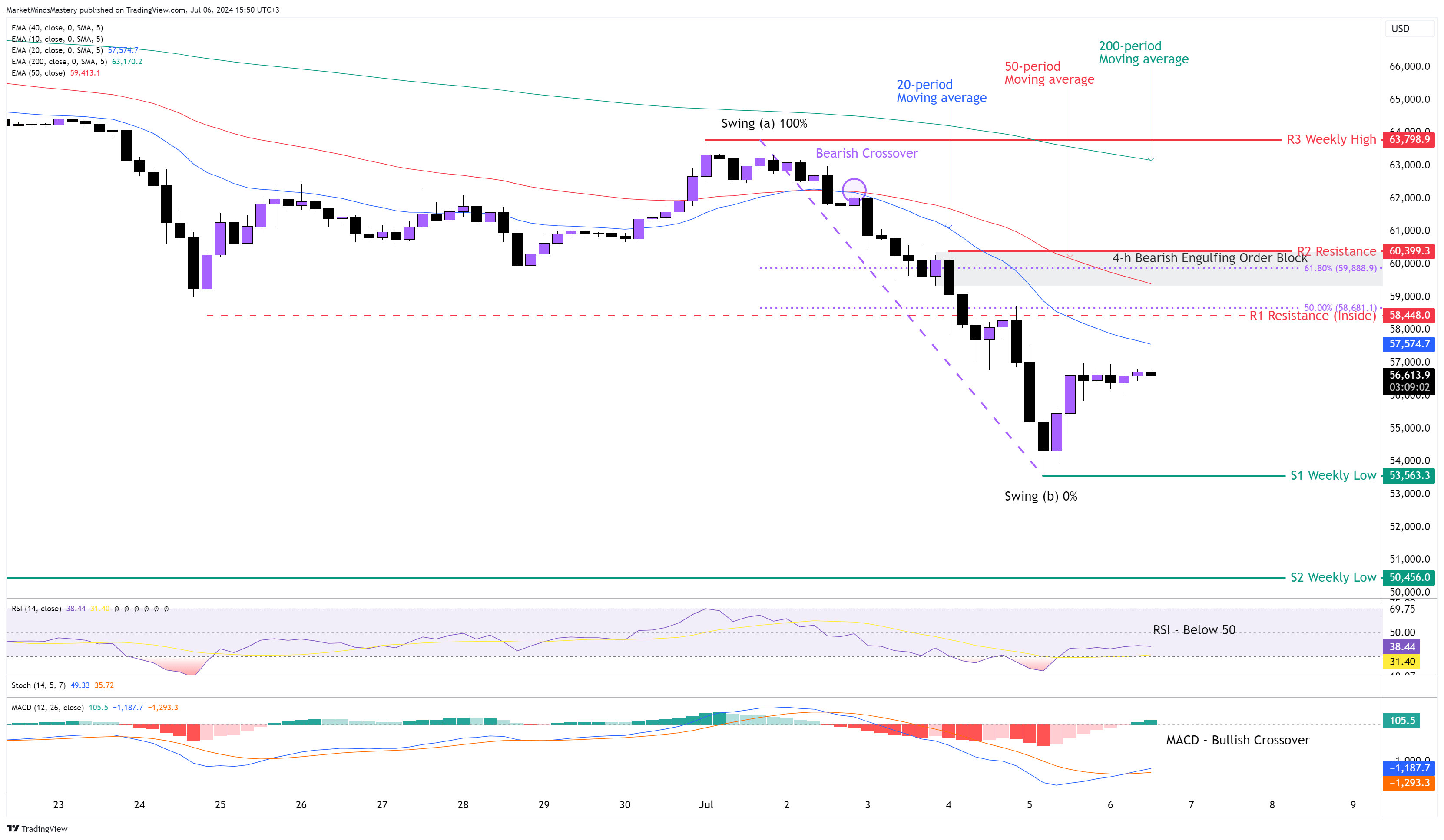 من ناحية أخرى، إذا ارتد السعر وتحرك لأعلى، فإن منطقة المقاومة الأولى، R1، ستكون المقاومة الداخلية R1 حول 58448 دولار. يعتبر هذا المستوى مهمًا لأنه يتطابق مع مستوى تصحيح فيبوناتشي 50٪. إذا اخترق السعر R1 واستمر في التحرك لأعلى. في هذه الحالة، فإن المقاومة التالية، R2، ستكون المقاومة التالية R2 عند مستوى 60399 دولارًا، وهو مستوى مهم آخر لأنه لا يتكون من مستوى المقاومة الثابت فحسب، بل أيضًا من نسبة فيبوناتشي الذهبية 61.8% و المتوسط المتحرك لفترة 50 و المتوسط المتحرك و مجموعة أوامر الابتلاع الهبوطية.