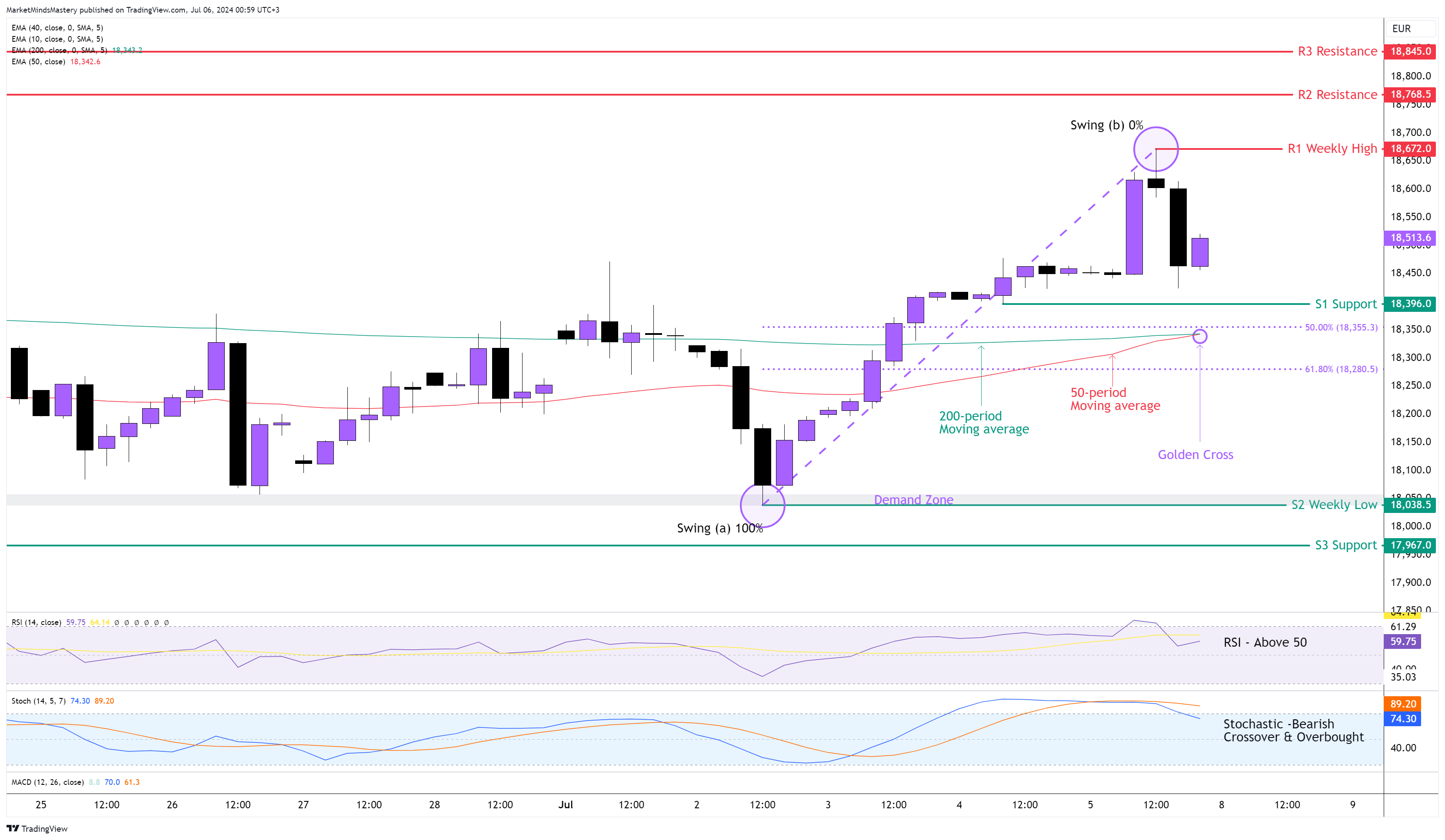 ومن ناحية أخرى، إذا وجد السعر دعمًا وارتد وتحرك لأعلى، فستكون منطقة المقاومة الأولى، R1، هي قمة الأسبوع السابق حول 18672. أما إذا اخترق السعر R1 وارتفع أكثر، فستكون منطقتا المقاومة التاليتان، R2 و R3، حول 18768 و 18845 على التوالي. كلا منطقتي المقاومة هاتين هما أعلى المستويات الأسبوعية القديمة;