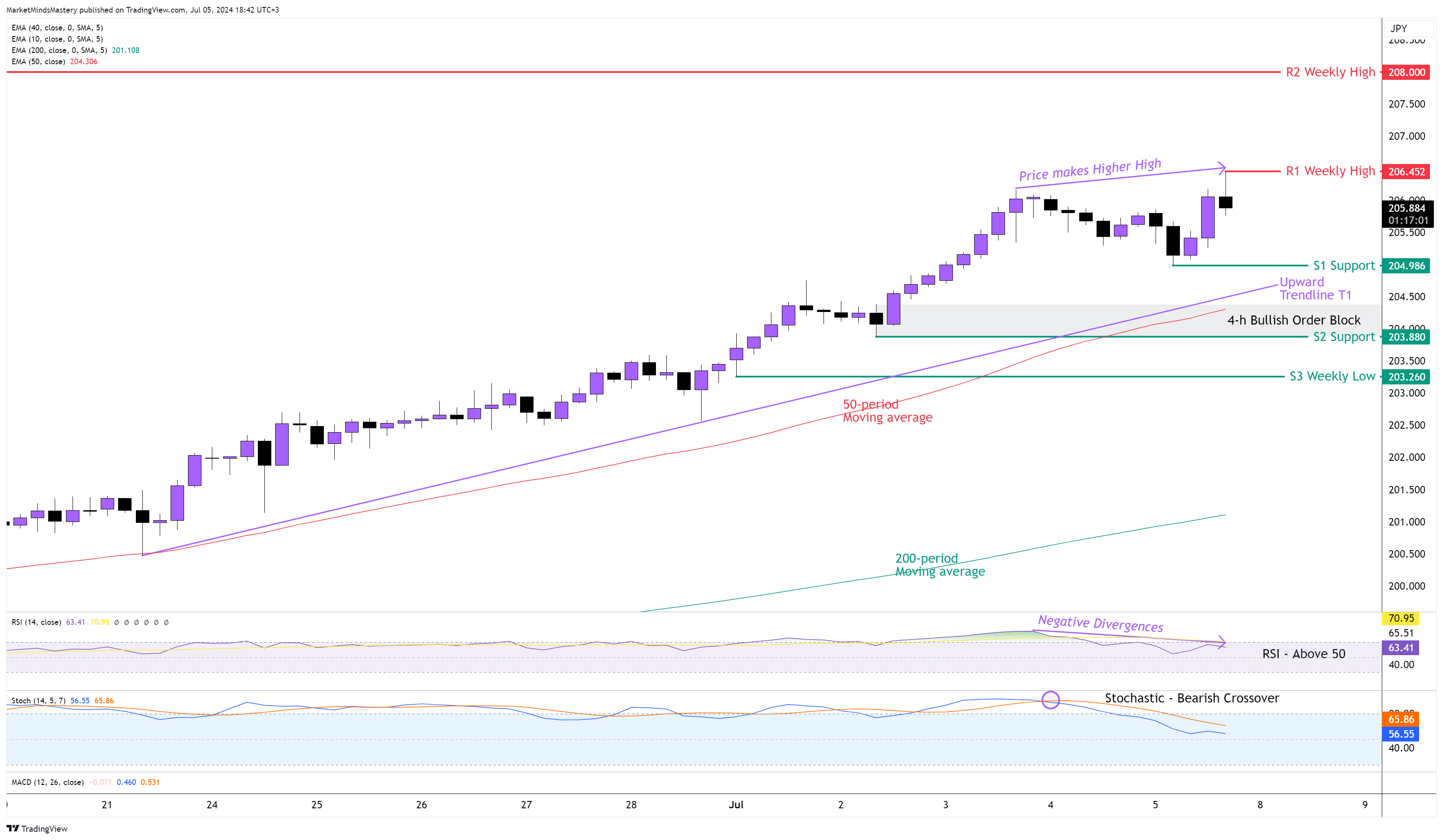 ابتداءً من يوم الاثنين، إذا دخل السعر في مرحلة تصحيحية وتحرك نحو الأسفل، ستكون منطقة الدعم الأولى هي قاع التأرجح عند S1، حول 204.98. إذا اخترق السعر خط S1 وأغلق تحته وتحرك إلى الأسفل، يمكن أن يكون خط الاتجاه الصاعد T1 بمثابة الدعم التالي. سيقود اختراق خط الاتجاه T1 السعر إلى الدعم الثابت التالي، S2، وهو قاع تأرجح آخر، حول 203.88. أنشأ هذا المستوى "كتلة أوامر صعودية" وعادة ما يصبح مستوى دعم مهم. إذا تحرك السعر لأسفل أكثر سيجد منطقة الدعم S3، حول 203، وهو قاع الأسبوع السابق. من ناحية أخرى، إذا وجد السعر دعمًا وارتد وتحرك لأعلى، ستكون منطقة المقاومة الأولى، R1، هي قمة الأسبوع السابق، حول 206.452، و R2، حول 208.