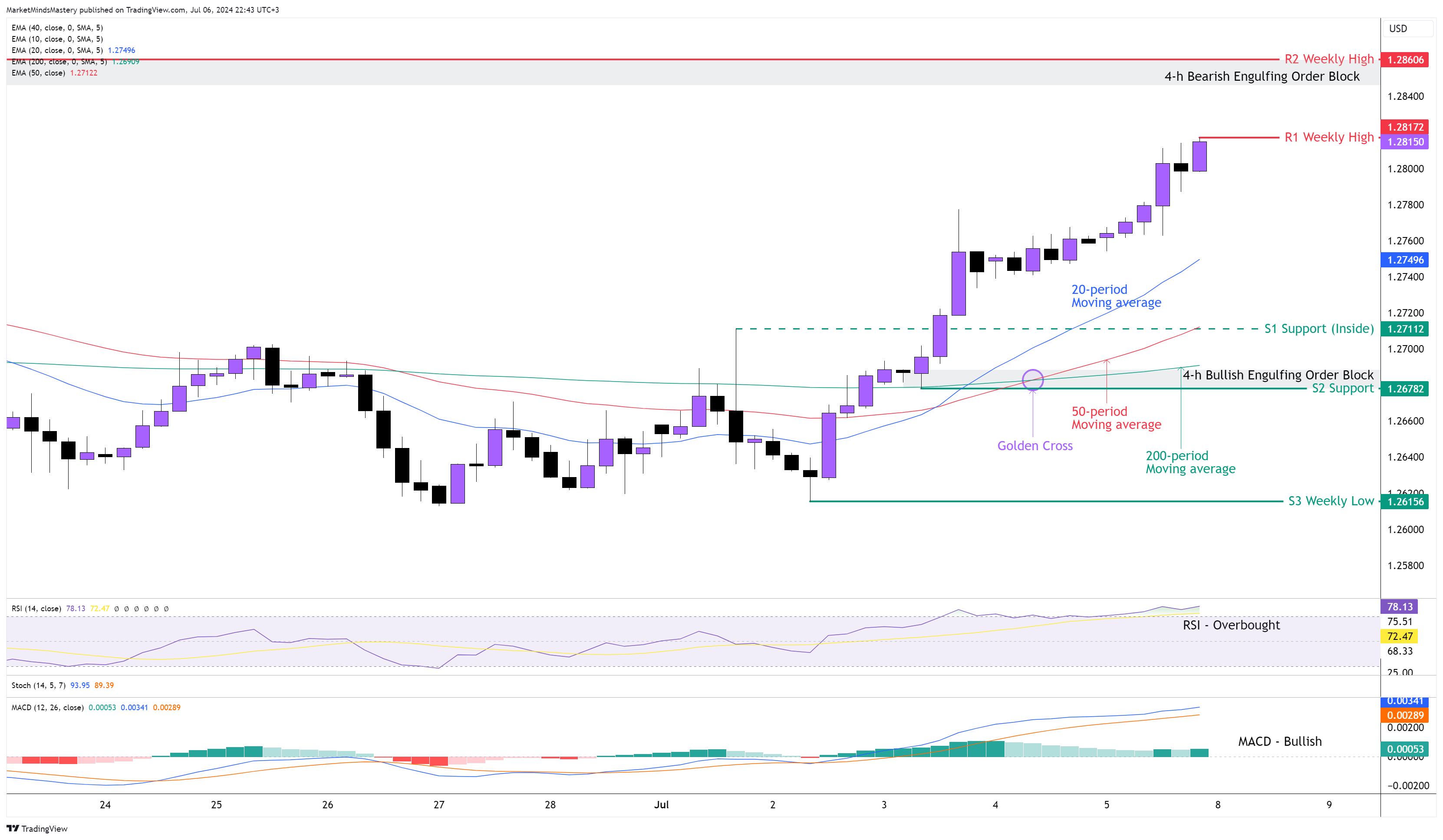 وعلى الرسم البياني لأربع ساعات، أنشأ السعر سلسلة من ارتفاعات أعلى وقيعان أعلى، وهو أمر صعودي. على الرغم من الرقم الموجب لـ NFP  يوم الجمعة الماضي، فقد انتهت الشمعة على مدار 4 ساعات كشمعة خارجية. الفترة  أعلى من المتوسط المتحرك لـ 200 فترة، مما يشير إلى الاتجاه الصعودي. وصل كل من مؤشر القوة النسبية ومؤشر ستوكاستيك مؤشر ستوكاستيك إلى منطقتي ذروة الشراء فوق 70 و80 على التوالي. وهذا مؤشر على وجود سوق قوية وصاعدة.