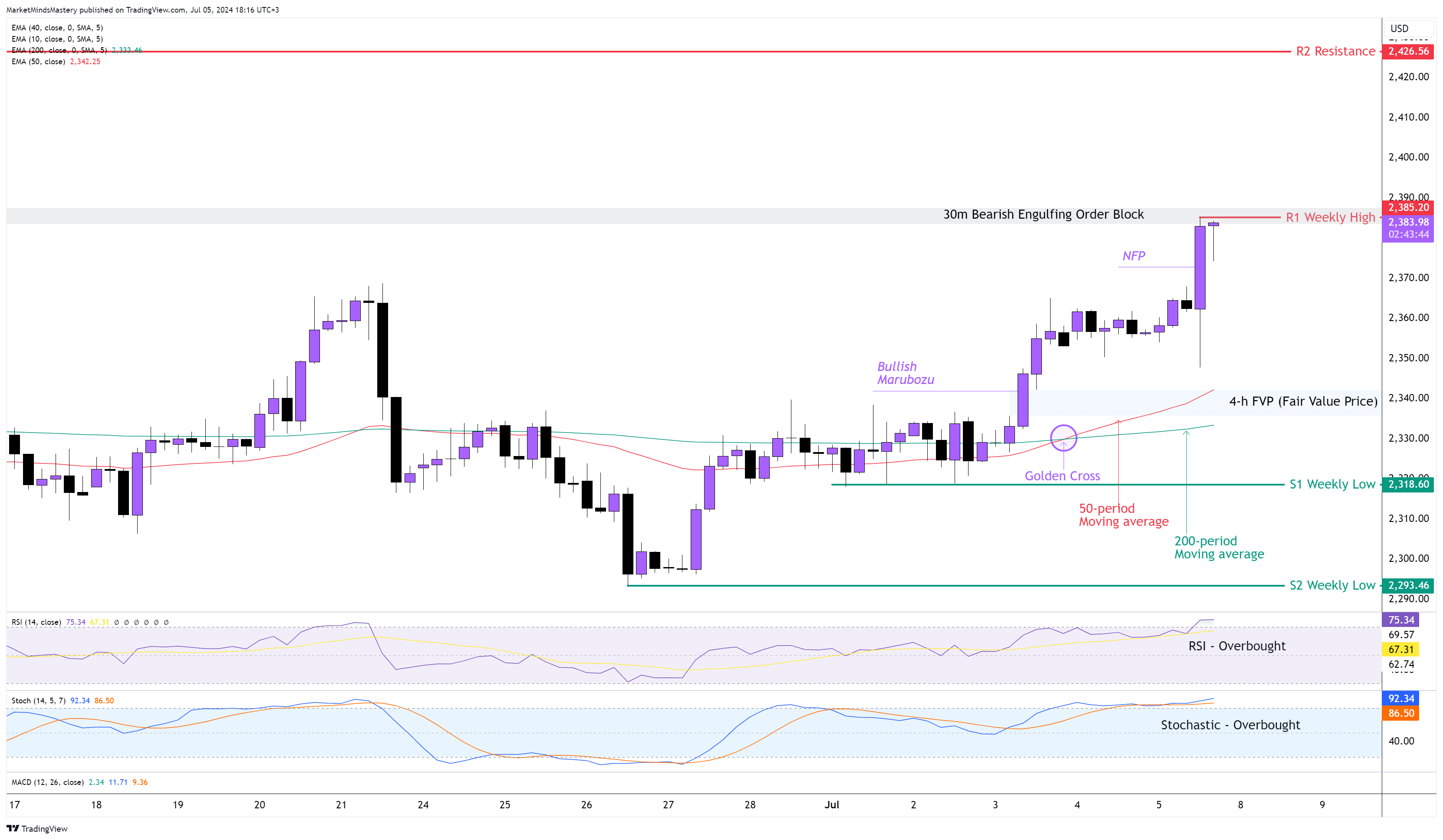 على الرسم البياني لمدة 4 ساعات، "ملأ" السعر "ملأ" FVP الذي حددناه في توقعات السوق الأسبوع الماضي. خلال حركته الصاعدة، أنشأ السوق شمعة ماروبوزو الصاعدة. وفي الوقت نفسه، ترك السعر وراءه شمعة FVP جديدة، كما هو موضح في الرسم البياني. أنشأ السعر اتجاهًا صعوديًا للسوق مع سلسلة من ارتفاعات أعلى وقيعان أعلى. أنشأت المتوسطات المتحركة تقاطعًا ذهبيًا ، وهو تقاطع صعودي منذ الوقت الذي عبر فيه المتوسط المتحرك لفترة 50 فوق فترة 200. يوجد كل من مؤشر RSI> فوق مستوياتهما القصوى العليا، مما يجعل كلاهما تجاوزا فوق مستوياتهما القصوى. وهذا مؤشر على وجود سوق ذات اتجاه صعودي قوي. إذا استمر السعر في التحرك لأعلى، ستكون منطقة المقاومة الأولى، R1، هي أعلى مستوى في الأسبوع السابق، حوالي 2385 دولارًا. إذا اخترق السعر R1 واستمر في الارتفاع، فستكون المقاومة التالية، R2، حوالي 2426 دولارًا.