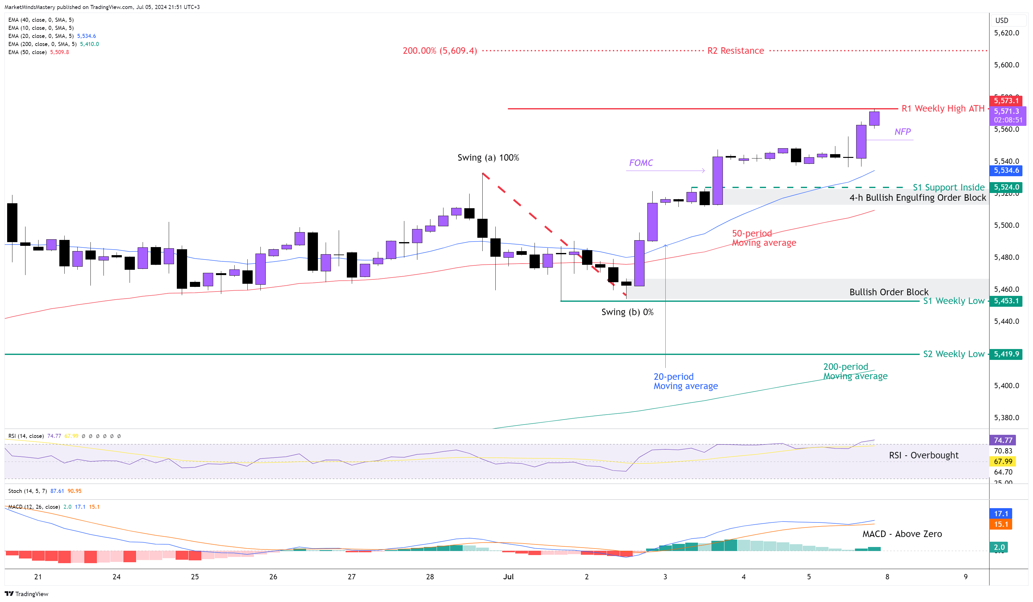 على العكس من ذلك، إذا تم رفض السعر وتحرك السعر للأسفل، فإن منطقة الدعم الأولى، S1، ستكون منطقة الدعم الأولى S1 هي الدعم الداخلي  حول 5524 دولارًا. أسفل دعم S1 مباشرة، توجد منطقة دعم S1 مباشرةً، توجد  كتلة أوامر صاعدة مبتلعة. سيجد المزيد من الانخفاض منطقة الدعم التالية، S2، حول 5453 دولارًا، وهو أدنى مستوى في الأسبوع السابق.
