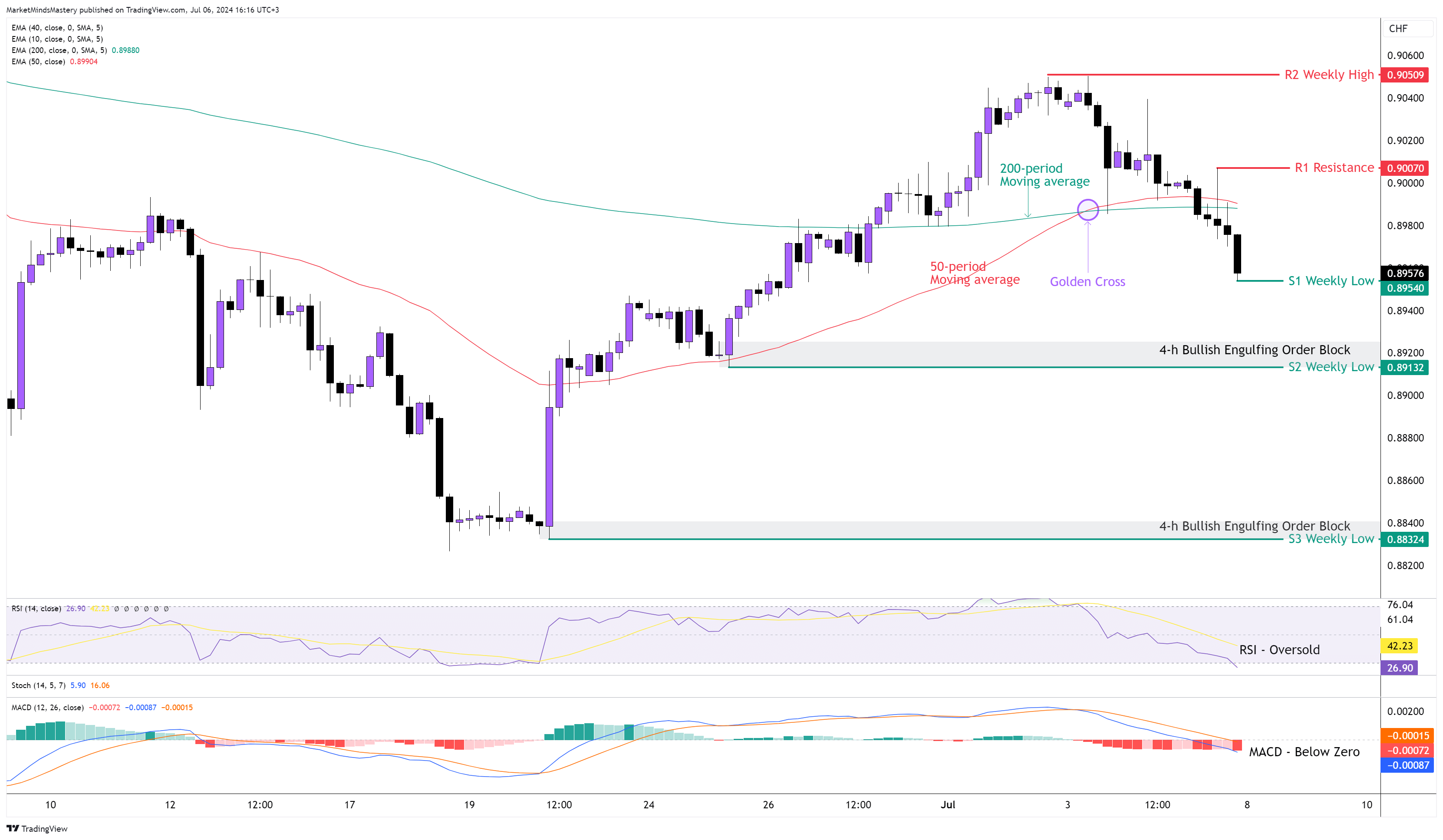 ابتداءً من يوم الاثنين، إذا استمر السعر في التحرك لأسفل، ستكون منطقة الدعم الأولى، S1، هي قاع الأسبوع السابق، حول 0.8954. إذا اتبع السعر الشمعة الانعكاسية الأسبوعية، سيتم اختراق مستوى S1، وسيتراجع السعر أكثر. وفي هذه الحالة، ستكون منطقة الدعم التالية، S2، حول مستوى 0.89132. كما هو موضح على الرسم البياني، تشكلت هناك كتلة أوامر هبوطية واضحة المعالم على مدى 4 ساعات. سيجد المزيد من الانخفاض منطقة الدعم التالية، S3، حول 0.88324.