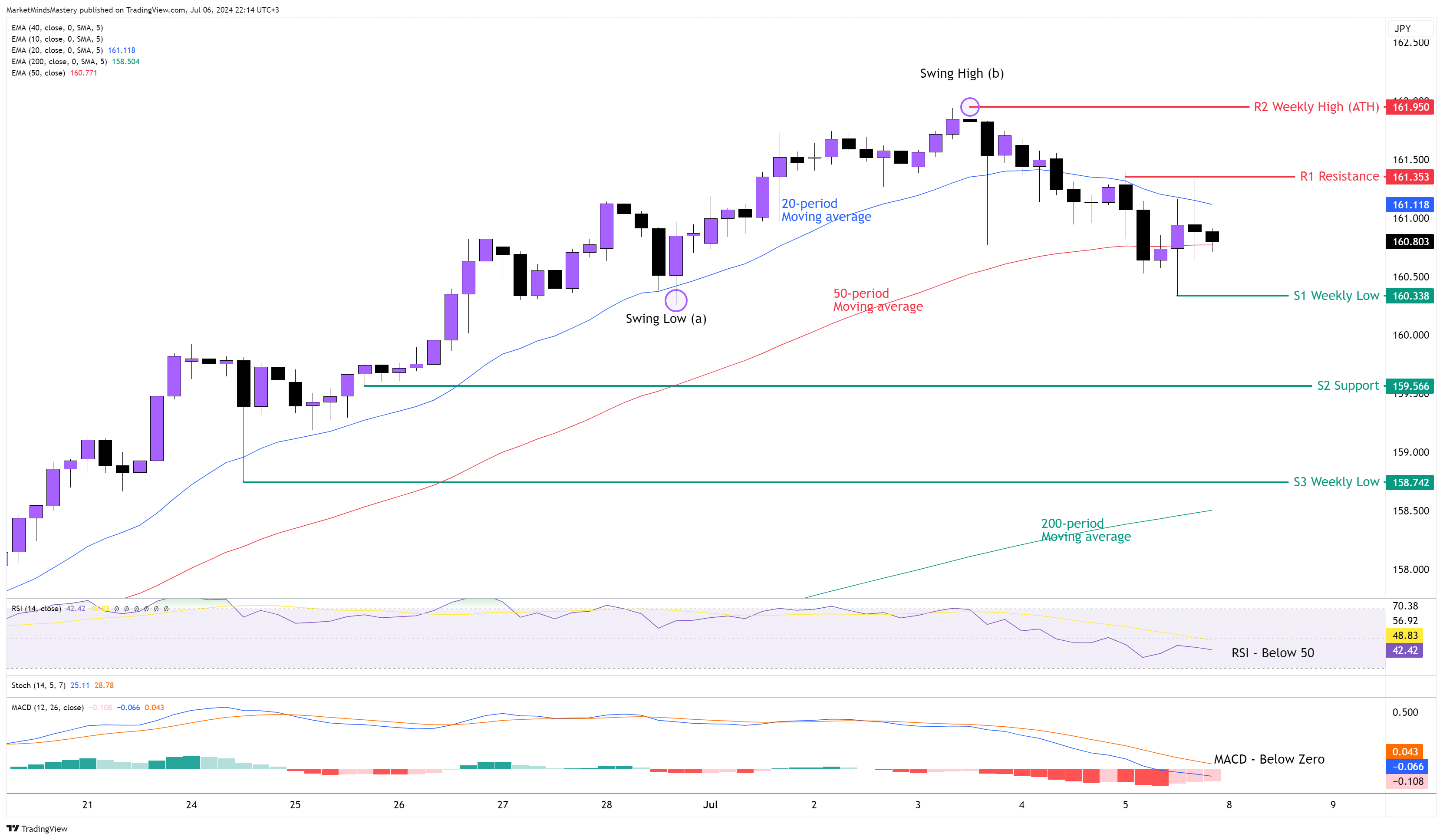 من ناحية أخرى، فإن مؤشر القوة النسبية أقل من 50، والمتوسط المتحرك لـ أقل من الصفر، وهناك رسم بياني هابط . ولذلك، إذا تحرك السعر للأسفل، فإن منطقة الدعم الأولى، S1، ستكون منطقة الدعم الأولى S1 هي قاع الأسبوع السابق، حول 160.33. إذا اخترق السعر S1 وأغلقت الشموع تحته، فقد يتطور اتجاه هابط. أي حركة هبوطية أخرى ستجد الدعم التالي، S3، حول 158.74، وهو قاع أسبوعي آخر.
