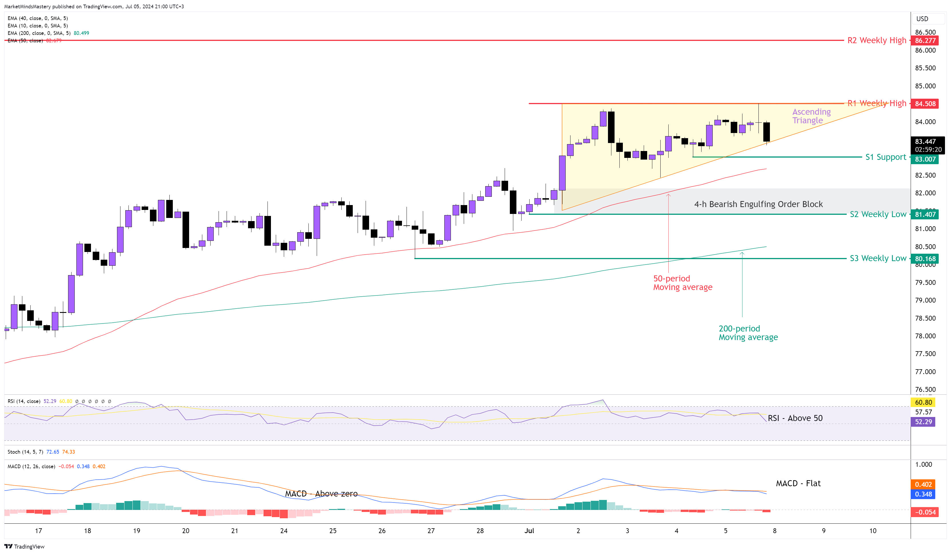 أيضًا، في الأسبوع الماضي، على الرسم البياني للأربع ساعات، أنشأ السوق نموذج استمرارية صعودية تسمى نمط المثلث الصاعد. لا يزال المتوسط المتحرك لـ  فوق المتوسط المتحرك لـ 200 فترة، وهو أمر صعودي. لا يزال مؤشر MACD مسطحًا ولا يزال فوق الصفر، وهو ما ينطوي على آثار صعودية. يقع مؤشر مؤشر التذبذب RSI فوق خط الوسط 50، وهو أيضًا مؤشر صعودي. إذا اتبعت السوق الآثار الصعودية للمثلث الصاعد وتحرك السعر لأعلى، فإن منطقة المقاومة الأولى، R1، ستكون أعلى مستوى في الأسبوع السابق، حوالي 84.50 دولارًا. إذا اخترق السعر فوق R1، وأغلقت الشمعة أيضًا فوق مستوى السعر، واستمر السعر في الارتفاع، مما يعني أن الاتجاه الصاعد سيستمر، وستكون منطقة المقاومة التالية، R2، هي قمة أسبوعية أخرى، حوالي 86.27 دولارًا.