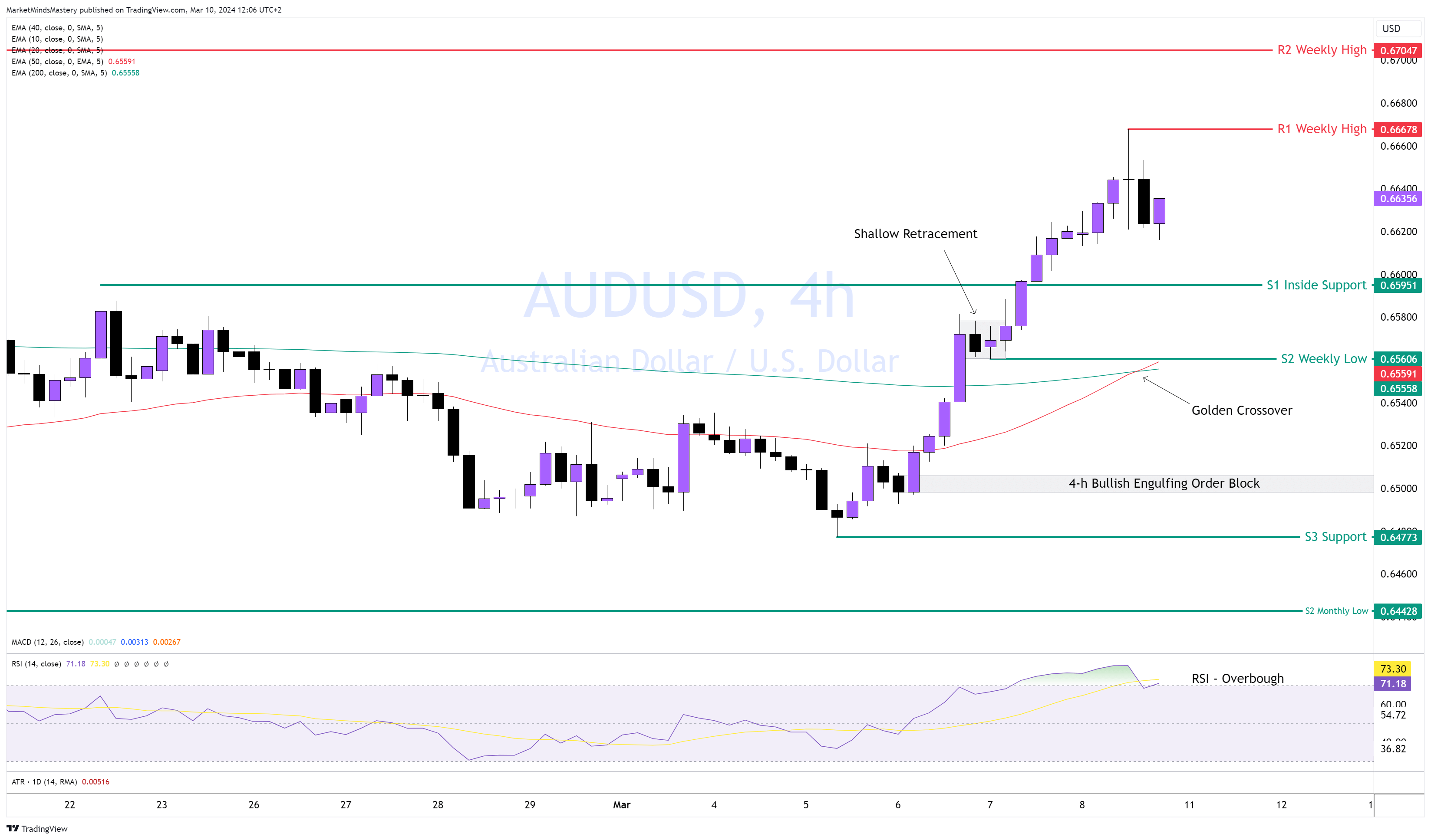 في أعقاب الحركة الصعودية التي شهدها الأسبوع الماضي على الدولار الأسترالي مقابل الدولار الأمريكي، اخترق السعر فوق مستوى 0.6600، مما أدى إلى تكوين قمة مرتفعة وقاع أعلى مؤكد. أيضًا، فإن مؤشر 4 ساعات مؤشر القوة النسبية في منطقة ذروة الشراء ، وهو ما ينطوي على آثار صعودية. تقاطع المتوسط المتحرك لـ 50 فترة فوق المتوسط المتحرك لـ 200 فترة، والمعروف باسم التقاطع الذهبي، مما يشير إلى سوق صاعد. ولذلك، إذا حافظ السعر على الزخم الصعودي من خلال التحرك لأعلى، فإن المقاومة الأولى R1 هي قمة الأسبوع السابق، حوالي 0.66678. إذا أغلق السعر فوق R1 وواصل الصعود، فإن المقاومة التالية، R2، هي القمة الأسبوعية، حول 0.67047 تقريبًا.