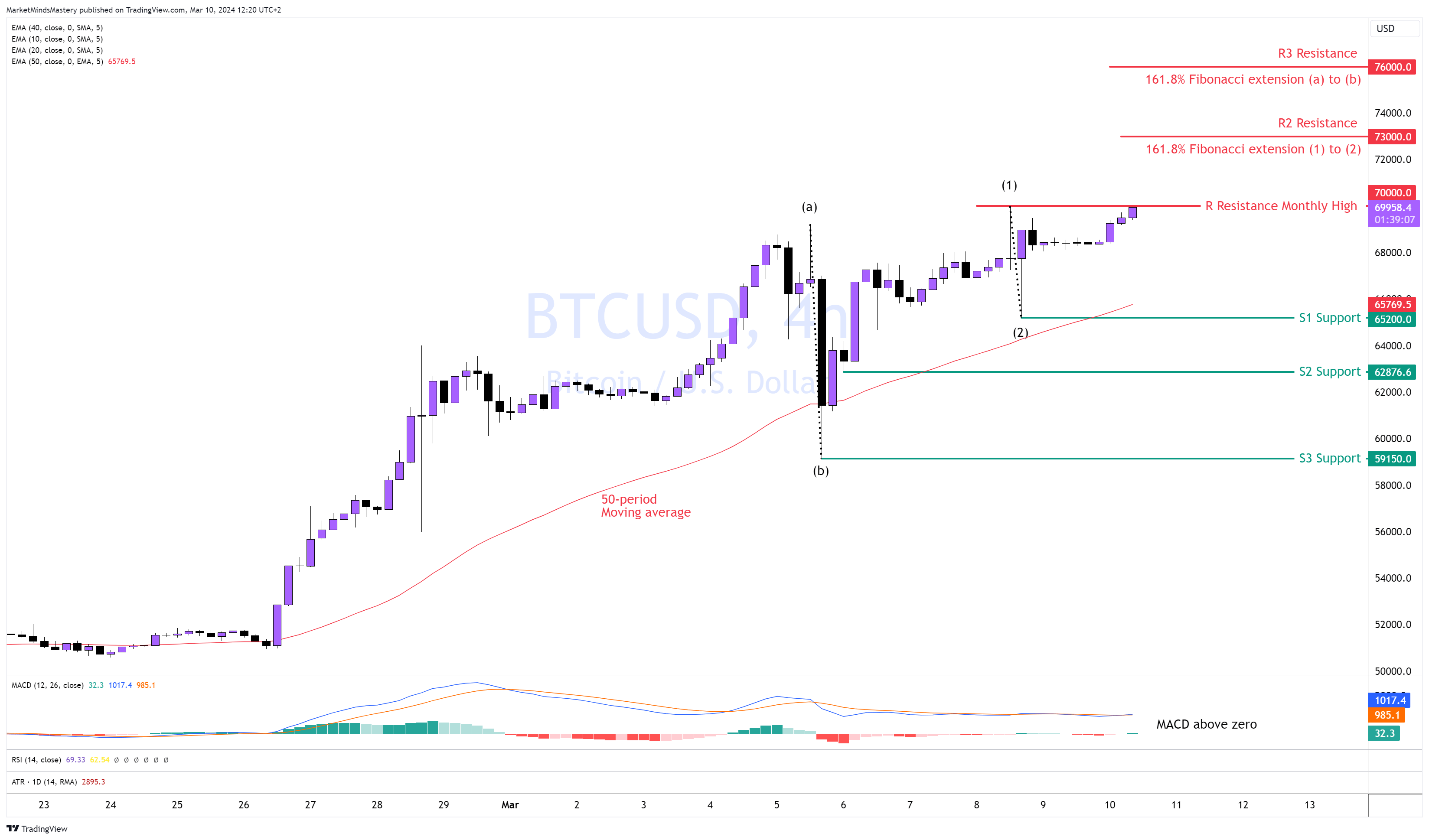 ومع ذلك، يمكن أن يحدث ارتداد محتمل، بالنظر إلى أن السعر عند أعلى مستوى جديد على الإطلاق. السعر فوق المتوسط المتحرك لـ 50 فترة، مما يشير إلى الاتجاه الصعودي. لا يزال مؤشر MACD فوق خط الصفر، مما يشير إلى سوق صاعد. ولذلك، إذا استمر السعر في الارتفاع، فإن منطقة المقاومة الأولى هي R1، حوالي 70000 دولار. باستخدام امتداد فيبوناتشي ، قمنا بتقدير هدفين محتملين إذا استمر السعر في الصعود.