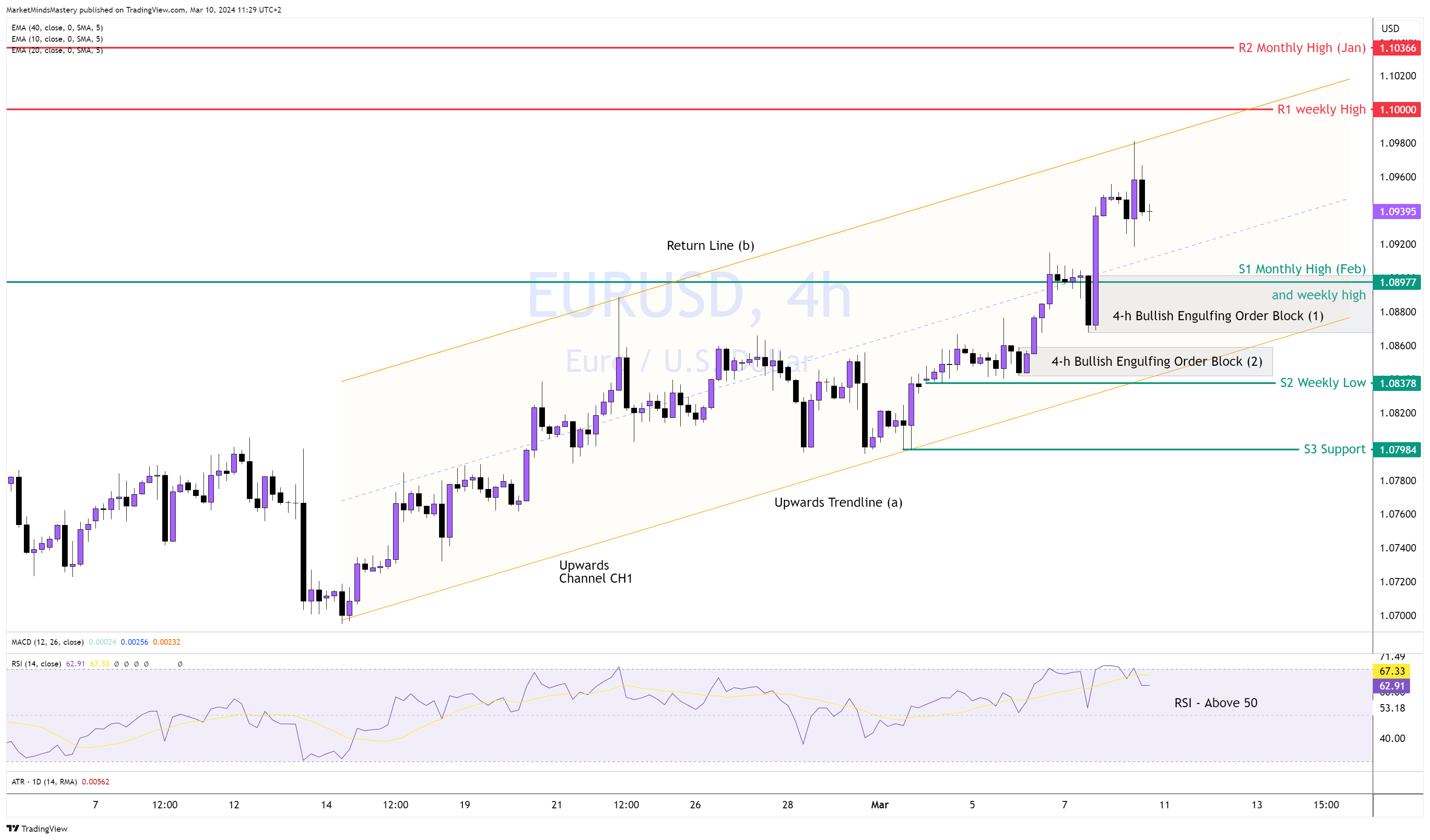 بالإضافة إلى ذلك، فإن مؤشر القوة النسبية فوق مستوى 50، مما يشير إلى وجود سوق صاعد - حيث ترك السعر وراءه كتلتين من أوامر الابتلاع الصعودية الراسخة. إذا استمر السعر في الارتفاع، فإن المنطقة 1.1000 هي المقاومة الأولى، R1. وتعتبر هذه المنطقة رقمًا مستديرًا ورقمًا نفسيًا للمتداولين. ولذلك، من المتوقع أن يحدث نشاط تداول مكثف. إذا اخترق السعر منطقة R1 وأغلق فوقها وواصل التحرك لأعلى، فإن المقاومة التالية، R2، هي 1.10366 تقريبًا، وهي أعلى سعر لشهر يناير.