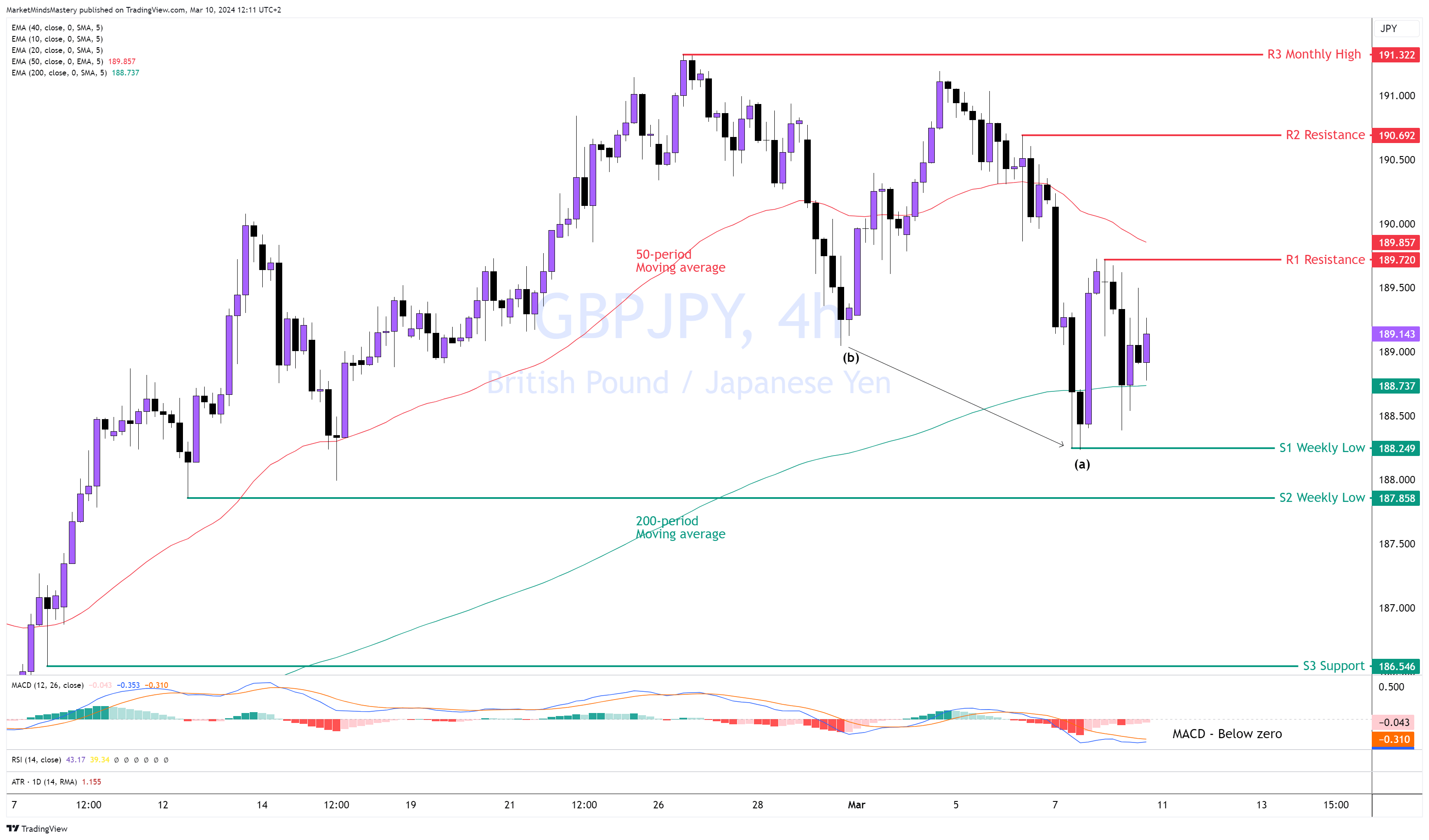 إذا تحرك السعر لأعلى، فإن المقاومة الأولى، R1، تقع حول 189.720. وهو أدنى بقليل من المتوسط المتحرك ل 50 فترة. أي حركة صعودية أخرى ستجد المقاومة التالية، R2، أعلى R1 بحوالي 100 نقطة فوق R1 بحوالي 190.692.