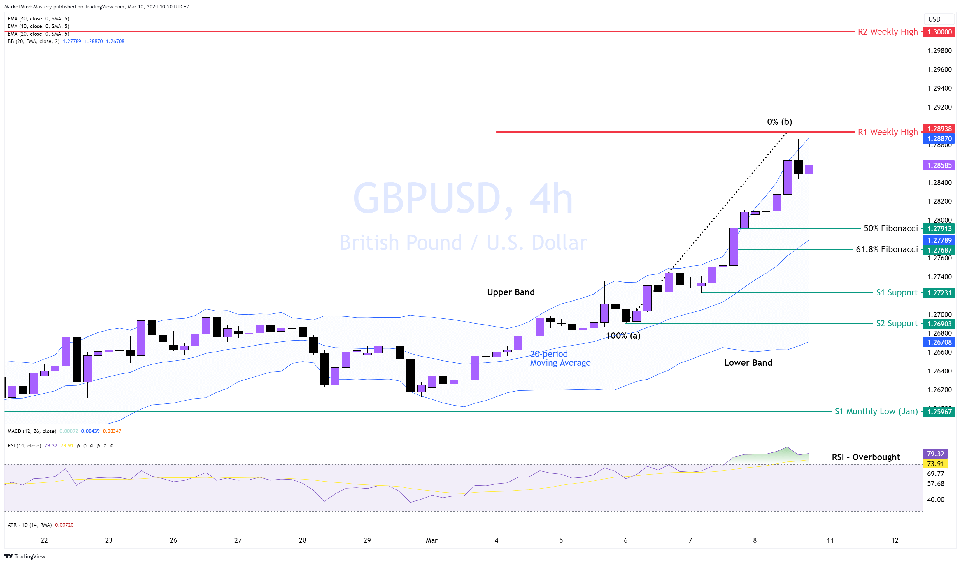 وبالإضافة إلى ذلك، فإن مؤشر القوة النسبية يوجد في حالة ذروة الشراء، مما يؤكد قوة المشترين. ولذلك، إذا استمر السعر في التحرك لأعلى، فهناك قمة الأسبوع الماضي كمقاومة R1، حول مستوى 1.28938. إذا تجاوز السعر وتحرك لأعلى، فإن المقاومة التالية، R2، تقع على بعد 100 نقطة تقريبًا عند حوالي 1.3000.