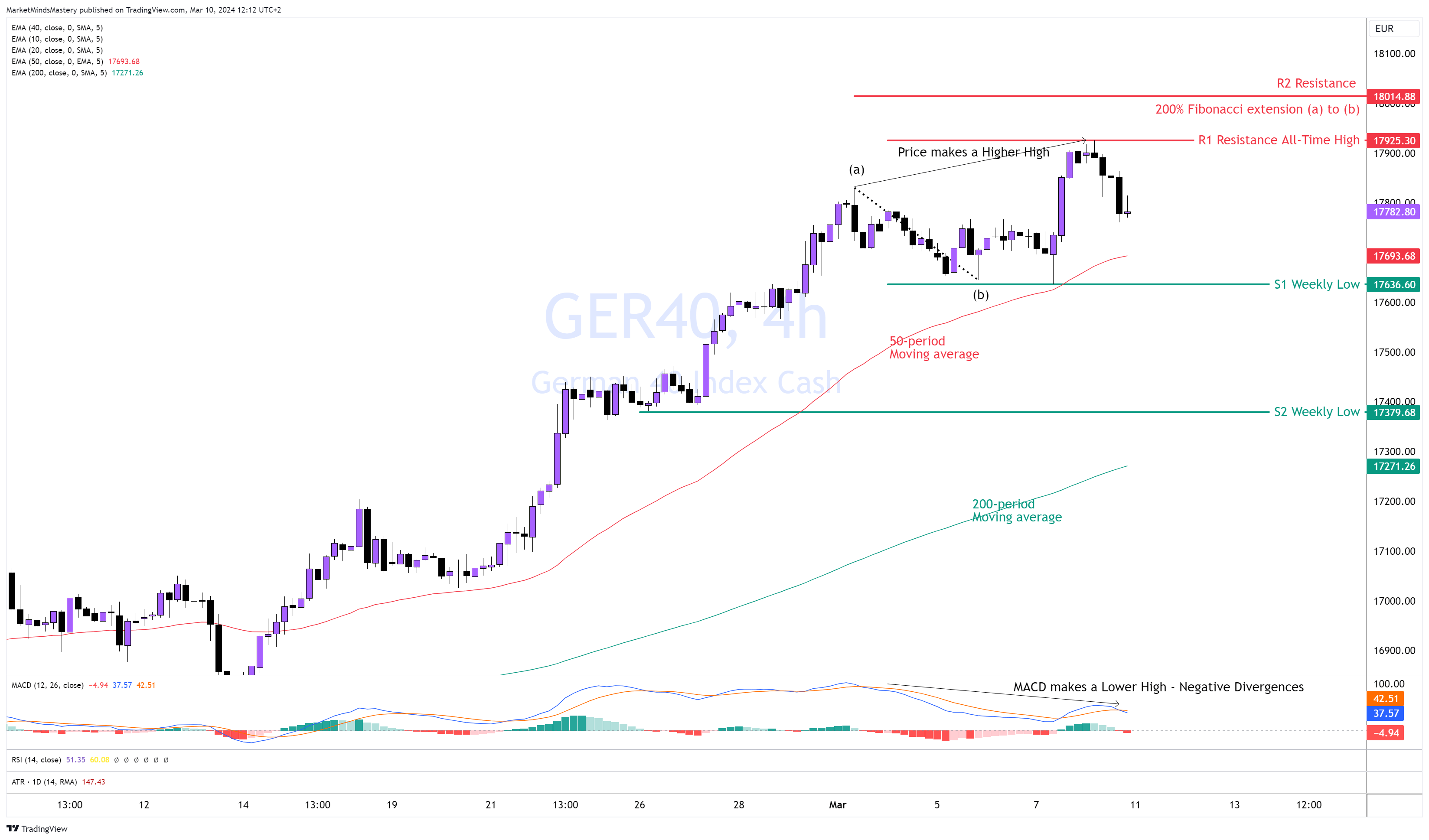 وعلى العكس من ذلك، إذا تحرك السعر لأعلى، فإن المقاومة الأولى، R1، هي السعر الأعلى على الإطلاق عند حوالي 17925.