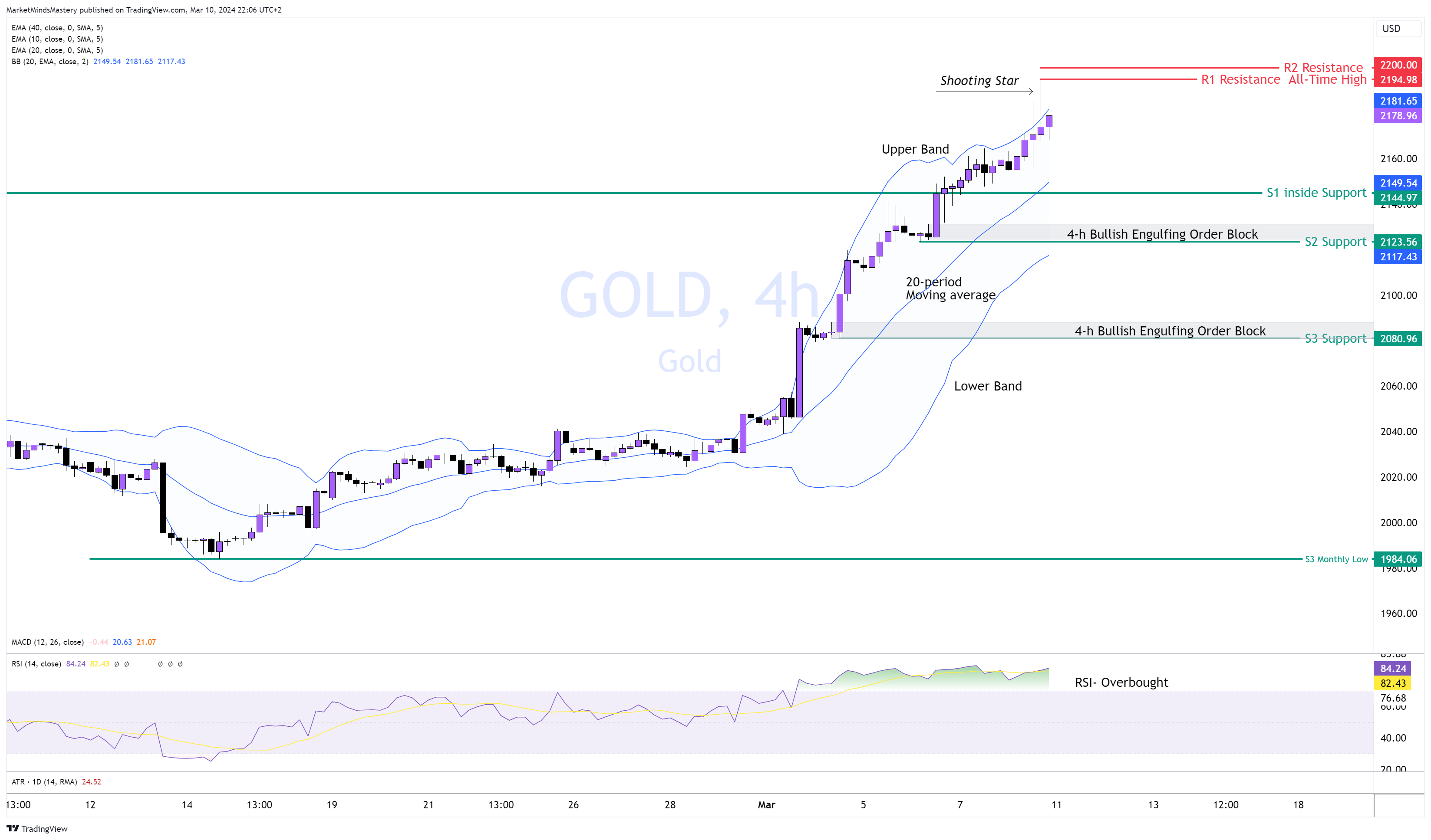 مؤشر "آر إس آي" كان في منطقة ذروة الشراء منذ الأول من مارس، مما يشير إلى الاتجاه الصعودي. يحافظ مؤشر "بولينجر باند" على السعر حول النطاق العلوي، وهو أمر صعودي أيضًا. ولذلك، إذا استمر السعر في الارتفاع، فإن السعر المرتفع على الإطلاق سيكون أول مقاومة في سوق الجلود. سيتم إنشاء قمة جديدة على الإطلاق إذا نجح السعر في اختراقها وأغلق فوقها. سنستخدم الرقم التقريبي القريب من السعر الحالي، وهو 2200. وعلى العكس من ذلك، إذا انخفض السعر وتحرك للأسفل، سيكون الدعم الأول هو الدعم الداخلي S1، حوالي 2144. وفي حالة حدوث مزيد من الهبوط سيجد السعر الدعم التالي، S2، عند مستوى 2123 تقريبًا. وقد تم إنشاء كتلة صاعدة مبتلعة على مخطط 4 ساعات عند هذا الدعم;
