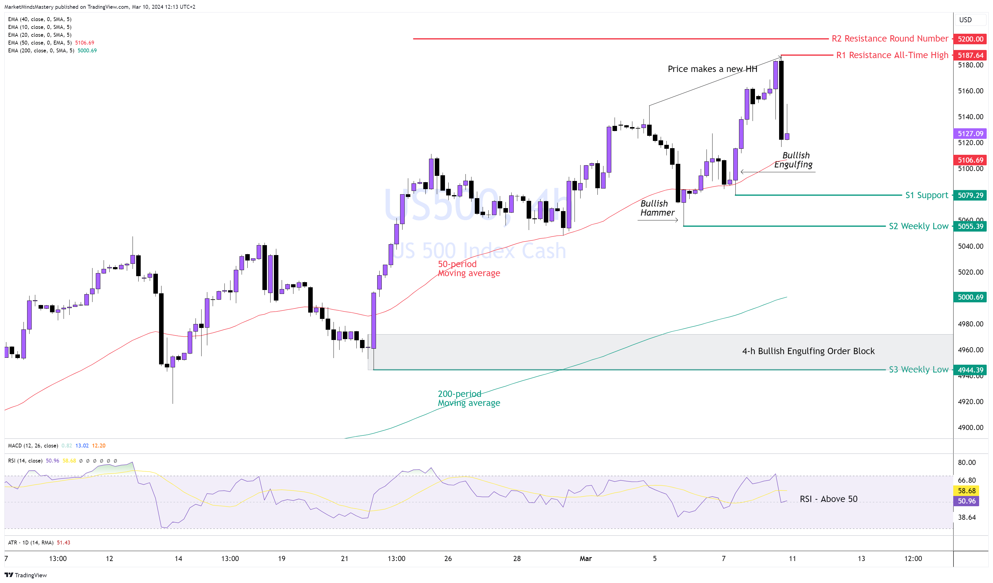 بعد حركة الأسبوع الماضي، دخل السعر يوم الأربعاء الماضي في منطقة "كتلة الأوامر الصاعدة المبتلعة" التي أشرنا إليها في تحليلنا الأسبوع الماضي وارتد منها متحركًا لأعلى، ليحقق أعلى مستوى له على الإطلاق، حوالي 5187. حدث ذلك خلال جلسة تداول نيويورك بعد الإعلان عن تقرير الوظائف غير الزراعية يوم الجمعة الماضي.
