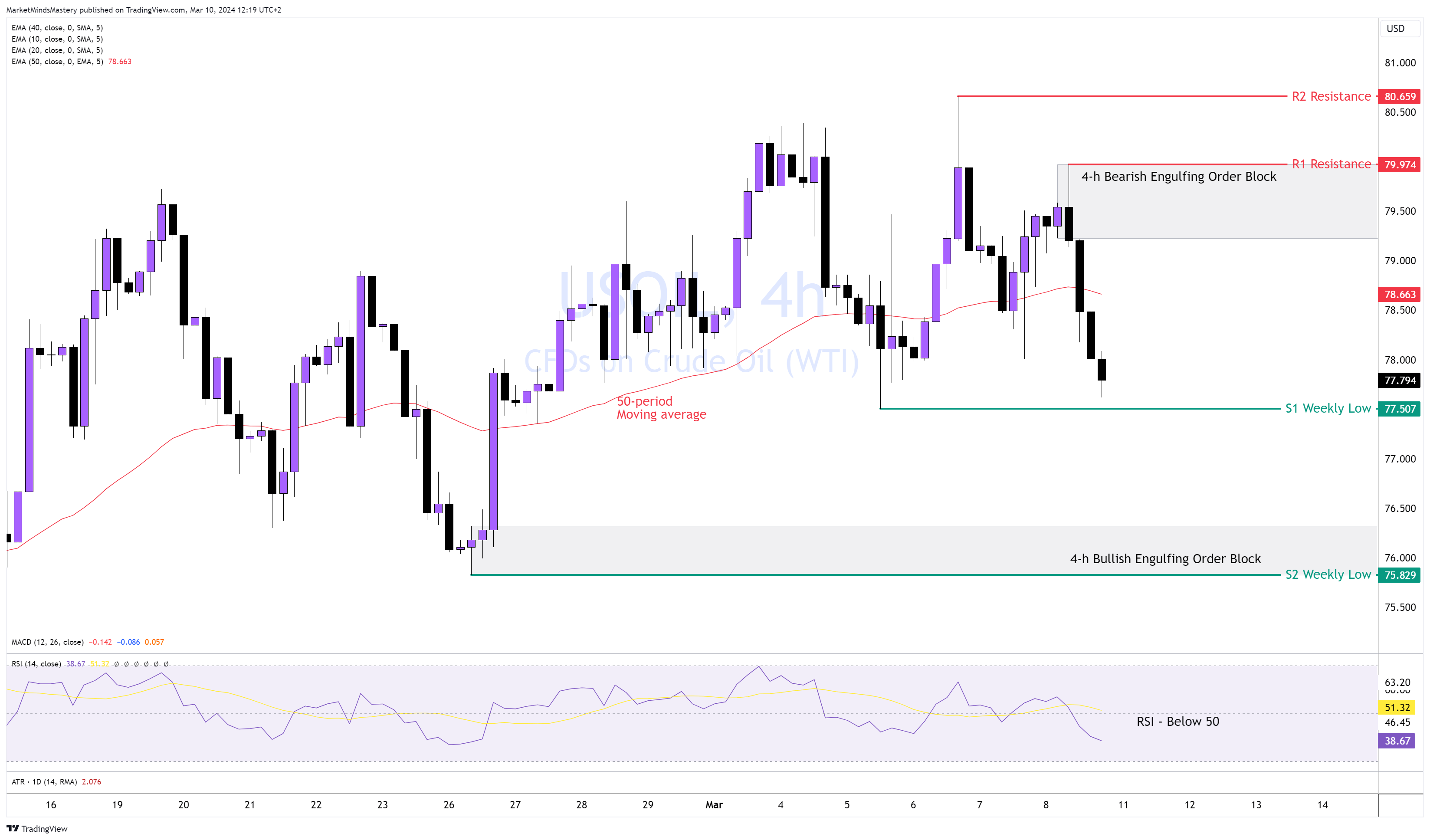 بالكاد وصل سعر USOIL إلى ما فوق 80 دولارًا الأسبوع الماضي، وعلى 4 هـ، استخدمنا كتلة الأوامر التي حددناها الأسبوع الماضي للدخول في بعض التحركات الصعودية. يتم تداول السوق بين منطقة 77.50 دولارًا - 80.50 دولارًا. ويقع السعر تحت المتوسط المتحرك لـ 50 فترة، وهو أمر هابط.