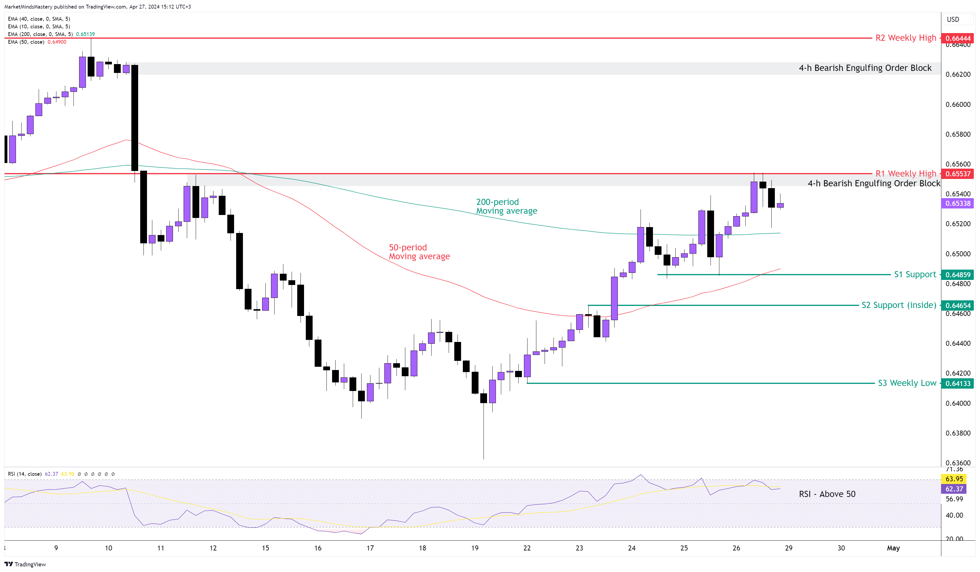 On the contrary, if the price continues making higher highs and higher lows, the first resistance, R1, will be the previous week’s high, with the 4-hour Bearish Engulfing Order Block around 0.65537. If the price penetrates the R1 and moves higher, the next resistance area is approximately 80 above 0.66444.
