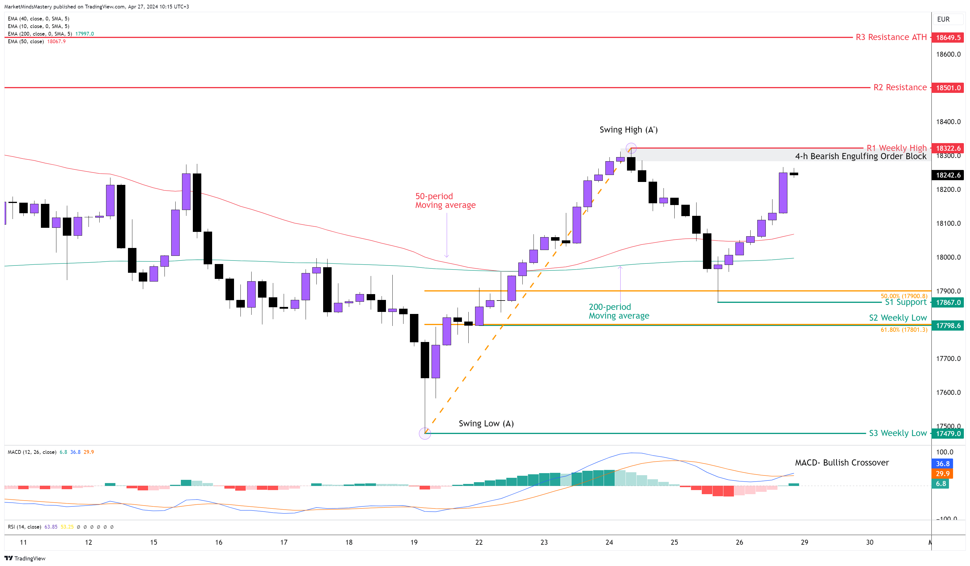 If the price breaks above the R1 and moves upwards, the next resistance area, R2, is approximately 18501. If the price breaks and closes above the R2 and keeps increasing, the next resistance area, R3, will be the All-Time High around 18650. On the other hand, if the price moves downwards, the first and second support areas, S1 and S2, are between 50% and 61.8% Fibonacci retracement, around 17867 and 17800, respectively. The S1 is especially critical because the Bullish Pin bar is low. If the price closes below the S1 and S2 and declines further, the next support area, S3, is around 17479, an old weekly low. Remember, if the price penetrates the Swing Low (A’), the uptrend we expected won't be valid any more.