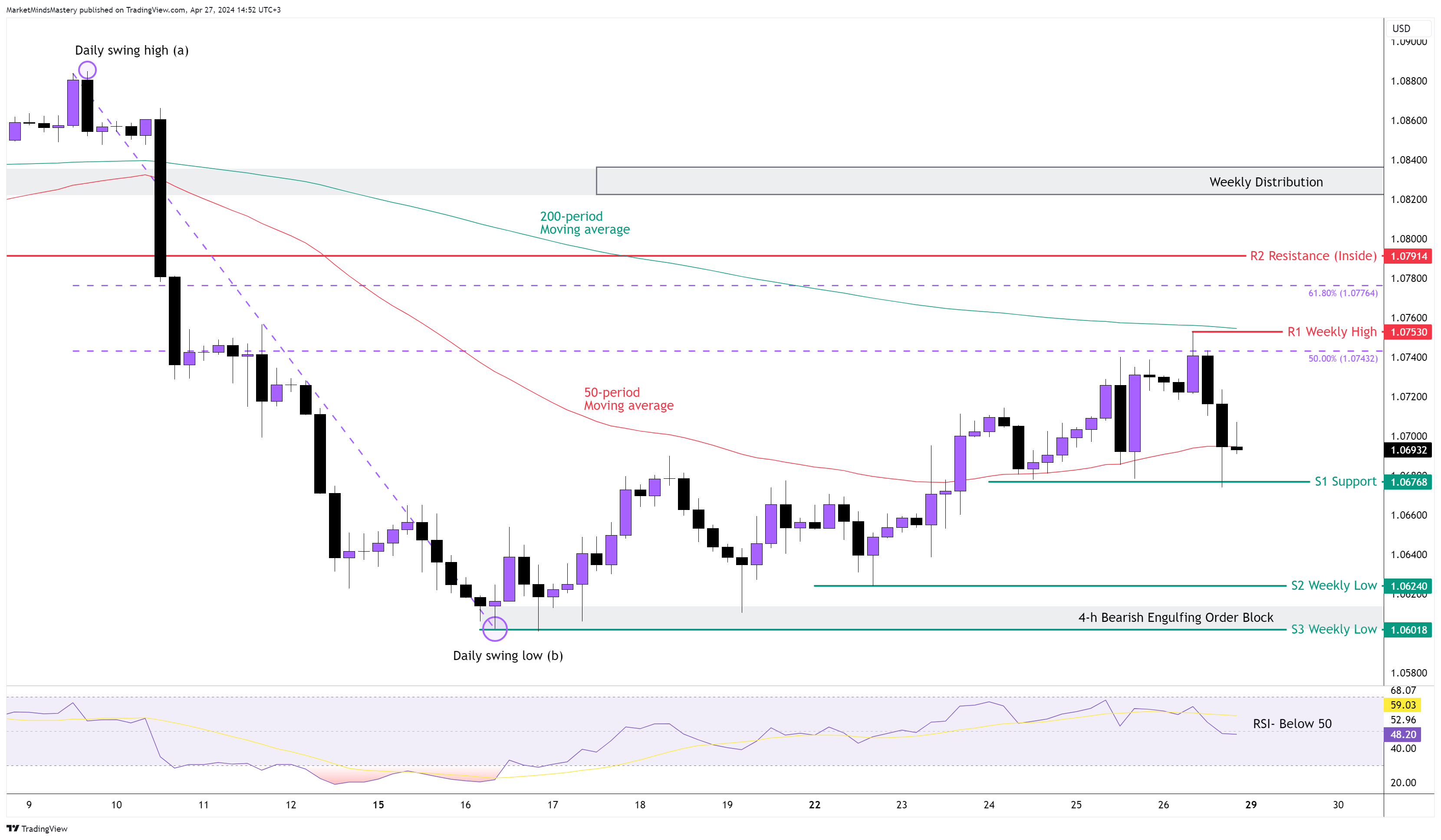If the price moves downwards, the first area of support S1 will be the previous week's low, around $2300. This level also includes a cluster of 50% retracement and a Bullish Engulfing Order Block. If the price moves below the S1, the next area of support, S2, is a Daily low that also consists of the Golden Ratio of 61.8%. Oppositely, if the price increases and the daily uptrend resumes, the first resistance area, R1, is the previous week’s high, just below $2400. At that level, a Bearish Engulfing Order Block was created. In case the price penetrates the R1 and moves higher, the next resistance area, R2, will be the high of the shooting star candle, around $2417.