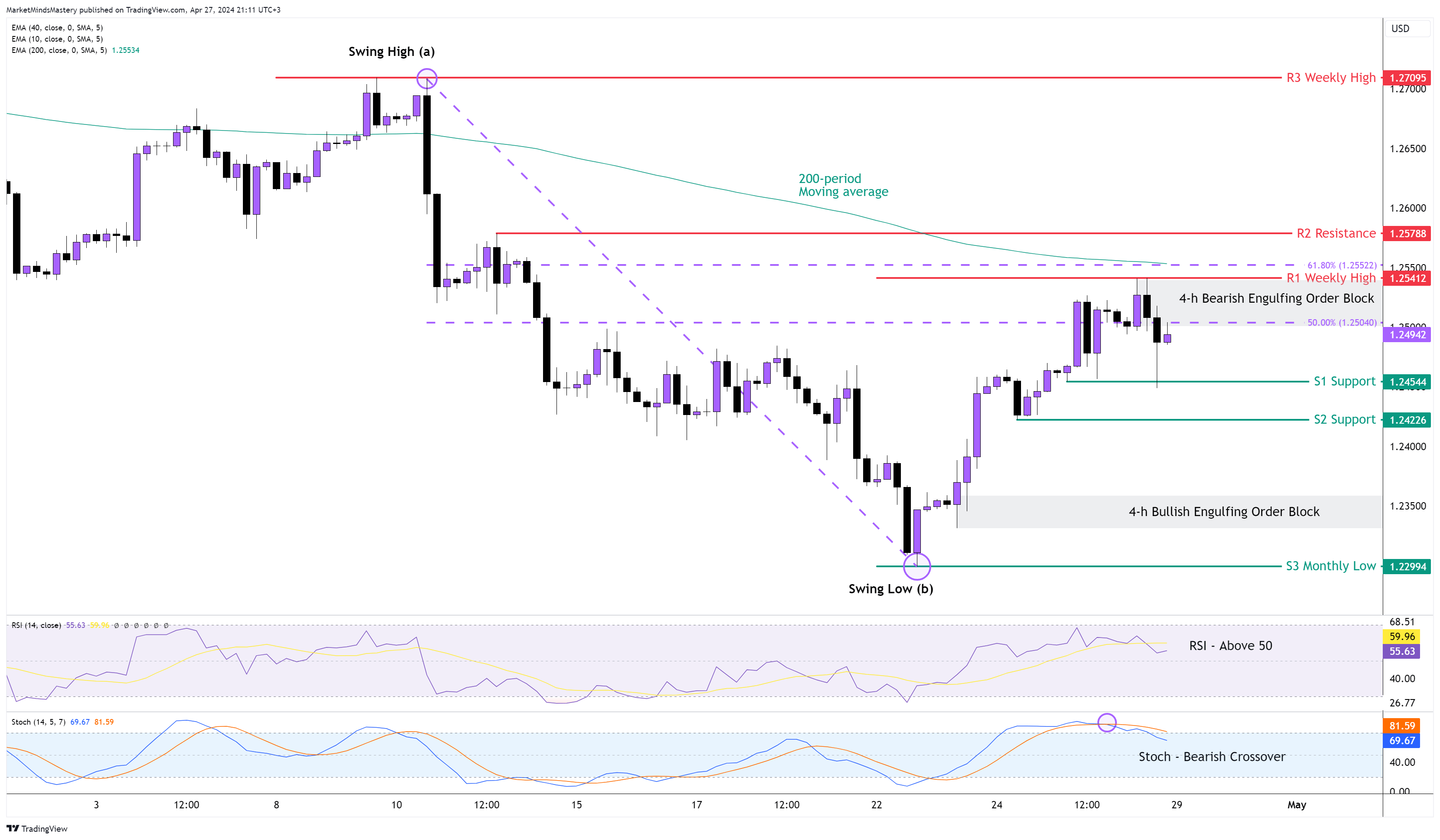On the other hand, if the price keeps increasing, the previous week’s high will become the R1 resistance around 1.25412. If the price breaks above the R1, the next resistance, R2, will be the confluence area between the 200-period moving average, the 61.8% Fibonacci retracement and the static resistance around 1.25788.