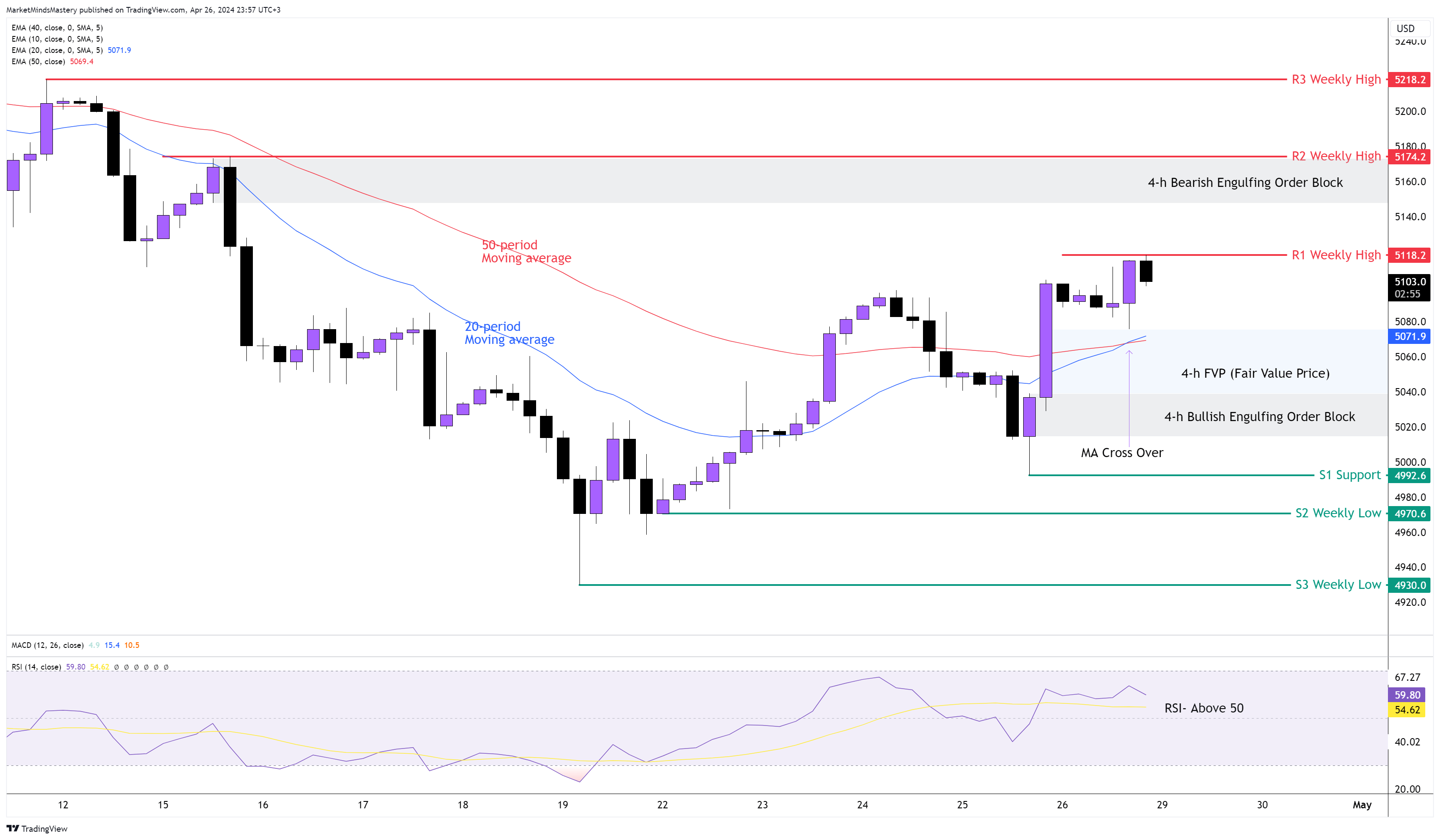 Considering the price's higher high and higher low, the RSI is above 50, and the bullish cross-over of the 20-period above the 50-period moving average, If the price continues to increase, the weekly uptrend will resume, and the first resistance area, R1, will be the previous week’s high, around $5118. If the price penetrates the R1 and keeps increasing, the next resistance area, R2, will be $5174. The Bearish Engulfing Order Block formed at R2 can cause a reaction to the price due to accumulative selling orders.