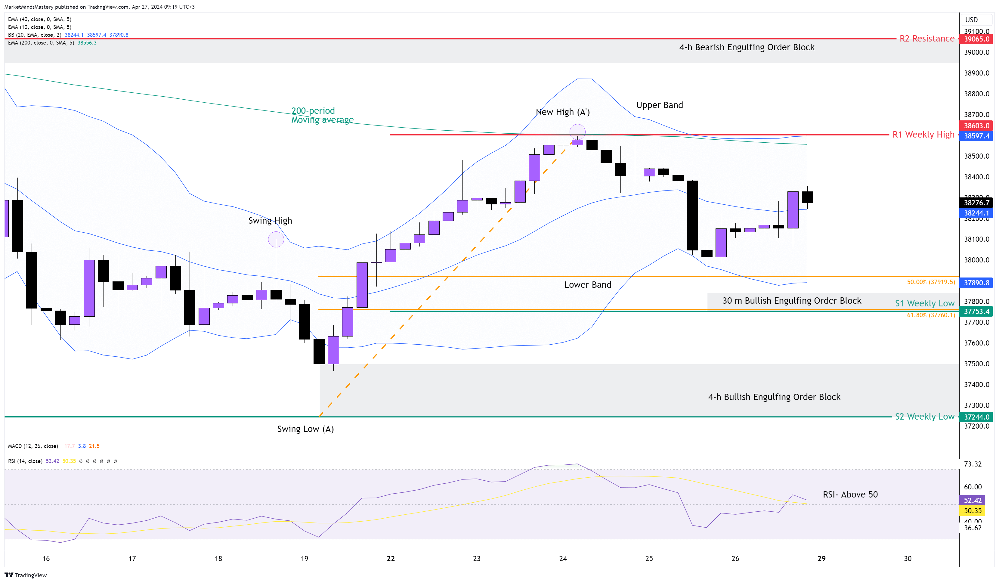 Currently, the price is above the middle of the Bollinger Band. The first resistance area, R1, will be around $38600 if it continues to move upwards. This area is significant because of the 200-period dynamic moving average, the previous week's high, the recent swing high, and the Upper Band of the BB. If the price penetrates through the R1, the next resistance area, R2, will be around $39000.