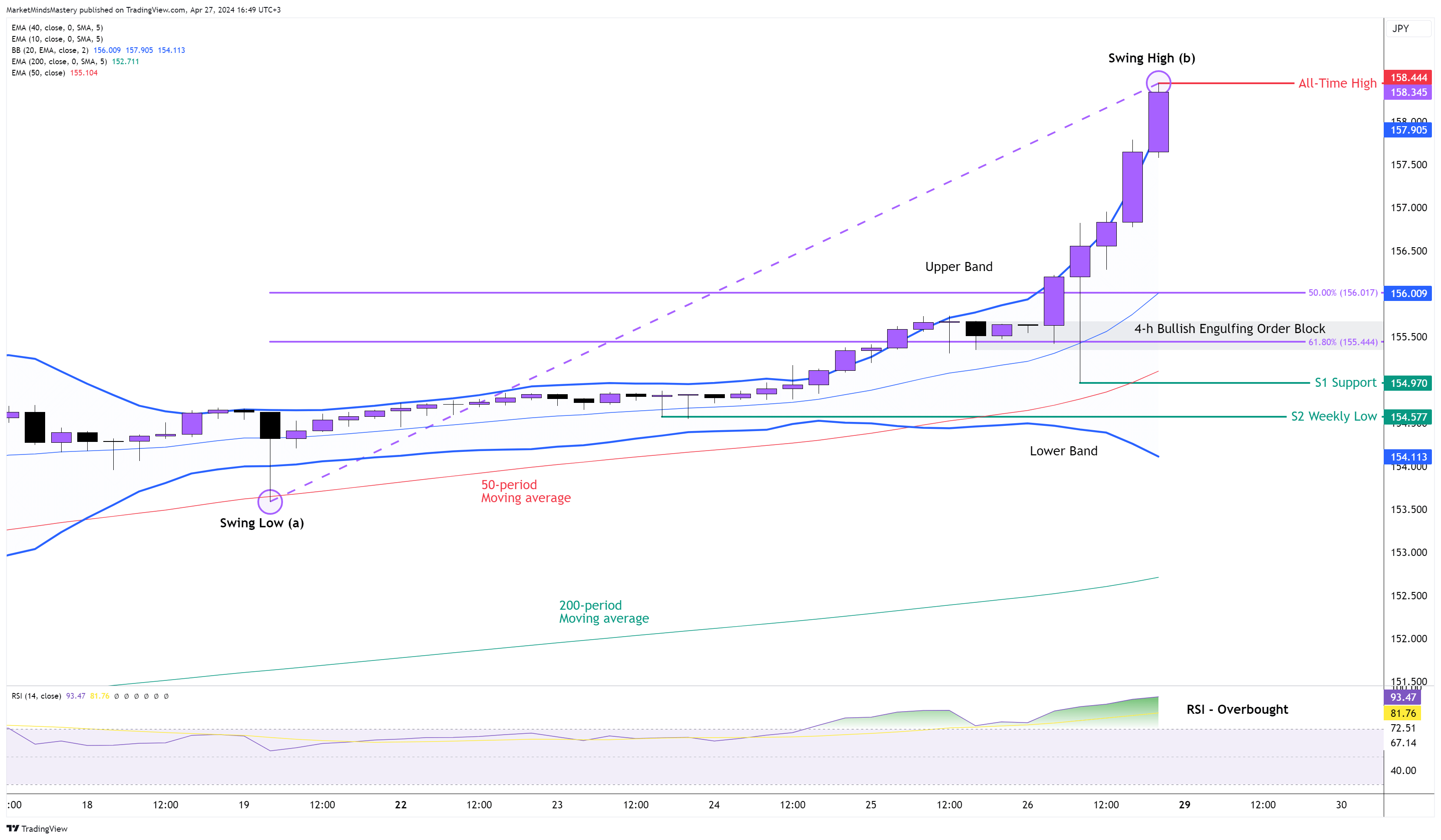 Last week, we witnessed the implementation of currency correlation. The USD was one of the strongest currencies, and we were expecting more robust moves by the Greenback. We mentioned it a lot in the previous week’s analysis. We also stated clearly that if the JPY fundamentally weakens and the USD keeps dominating, a breakout to the upside will be possible. Last week, the price did as we expected, and the market exploded to the upside. The price now registered a new ATH (All-time high) around 158.44. The price is “walking the upper band, " which is considered bullish. The 50-period is above the 200-period moving average, and their distance widens.