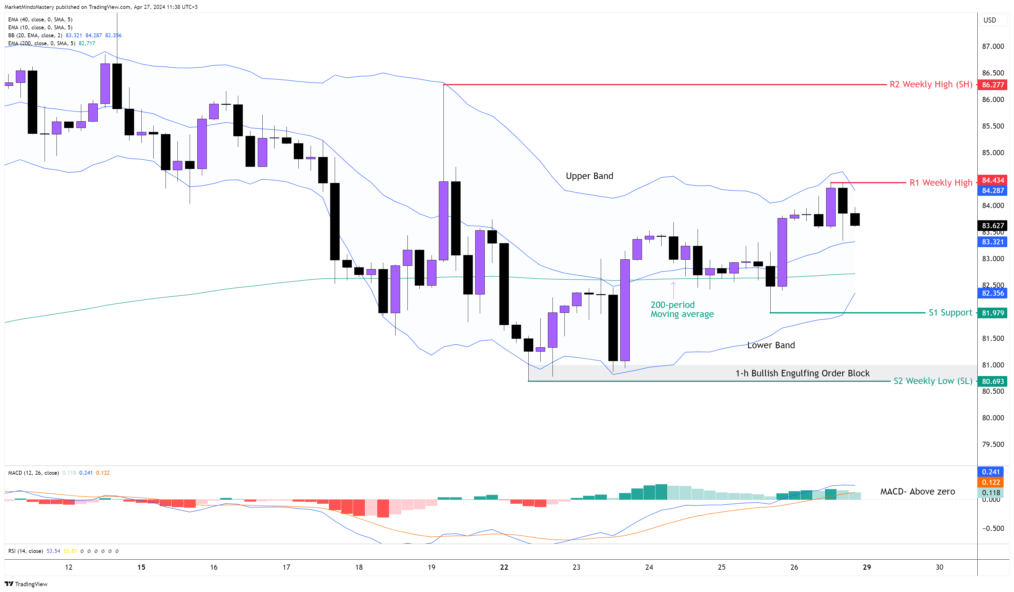 The price formed a double-bottom, creating a Bullish Engulfing Order Block on the intraday charts. However, on the 4-hour chart, the bullish candles are longer and more in quantity than the bearish candles, indicating the accumulation of buying orders in the market. The price is above the middle of the Bollinger Band, that is, the 20-period moving average is bullish.