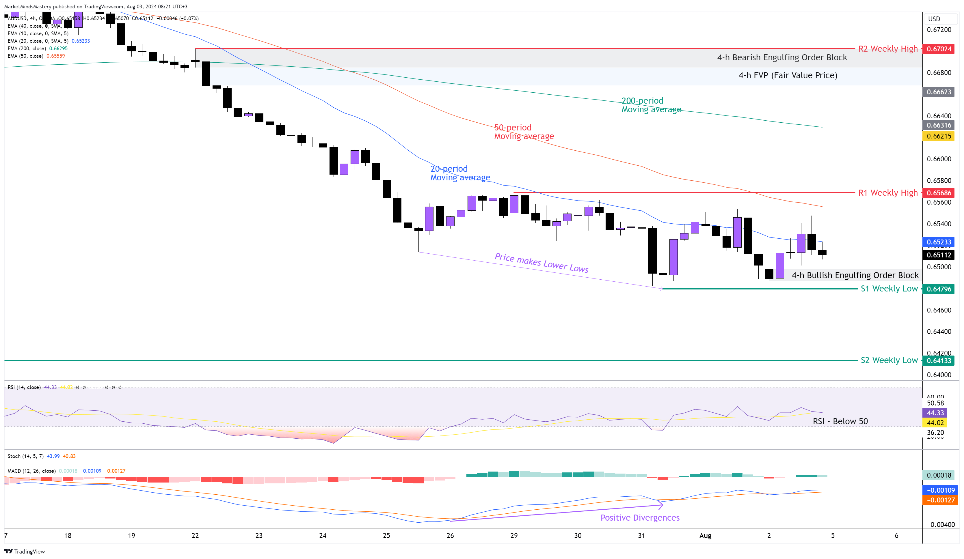 Following last week’s Market Outlook, the price of the AUDUSD kept declining primarily due to the negative CPI (Consumer Price Index) in Australia. Even though the US Dollar weakened on Friday because of the NFP outcome, the Aussie didn’t find a way to push the price higher. On the 4-hour chart, the price created a lower low formation, but under the disagreement of the MACD, which printed Positive Divergence, this has bullish implications. The price afterwards kept consolidation without any upward or downward breakout move, and this is a sign of potential market accumulation. The 20-period is below the 50-period moving average. The 200-period moving average is above both the 20 and the 50, and this shows a weak market. The RSI is below 50, and this is bearish. Starting Monday, if the price declines and moves downwards, the first support area, S1, will be the previous week’s low, approximately 0.64796. At this level, a Bullish Engulfing Order Block was left behind last Friday, which can provide additional support in a subsequent price decline. If the price penetrates the S1 and declines further, the next support area, S2, will be a weekly price low of around 0.64133.