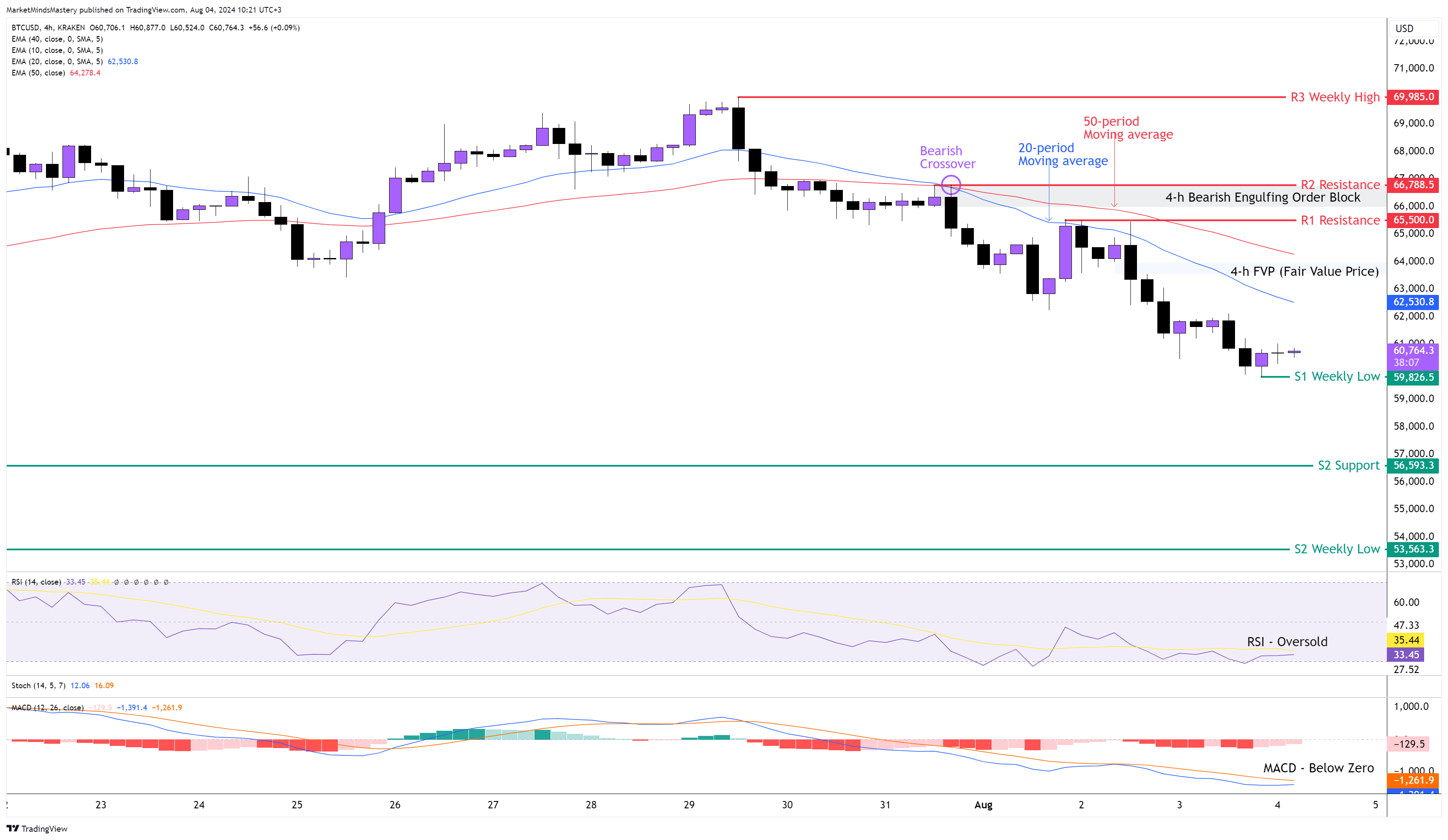 On the other hand, if the price moves upward, it means that it enters a corrective phase. Then, the first resistance area, R1, will be around $65500. This price level coexists with the 50-period moving average and can be considered a dynamic price resistance. If the price penetrates the R1 and increases more, the next resistance, R2, will be around $66788. At this price level, there is a Bearish Engulfing Order Block, which can be considered an additional resistance for the price.