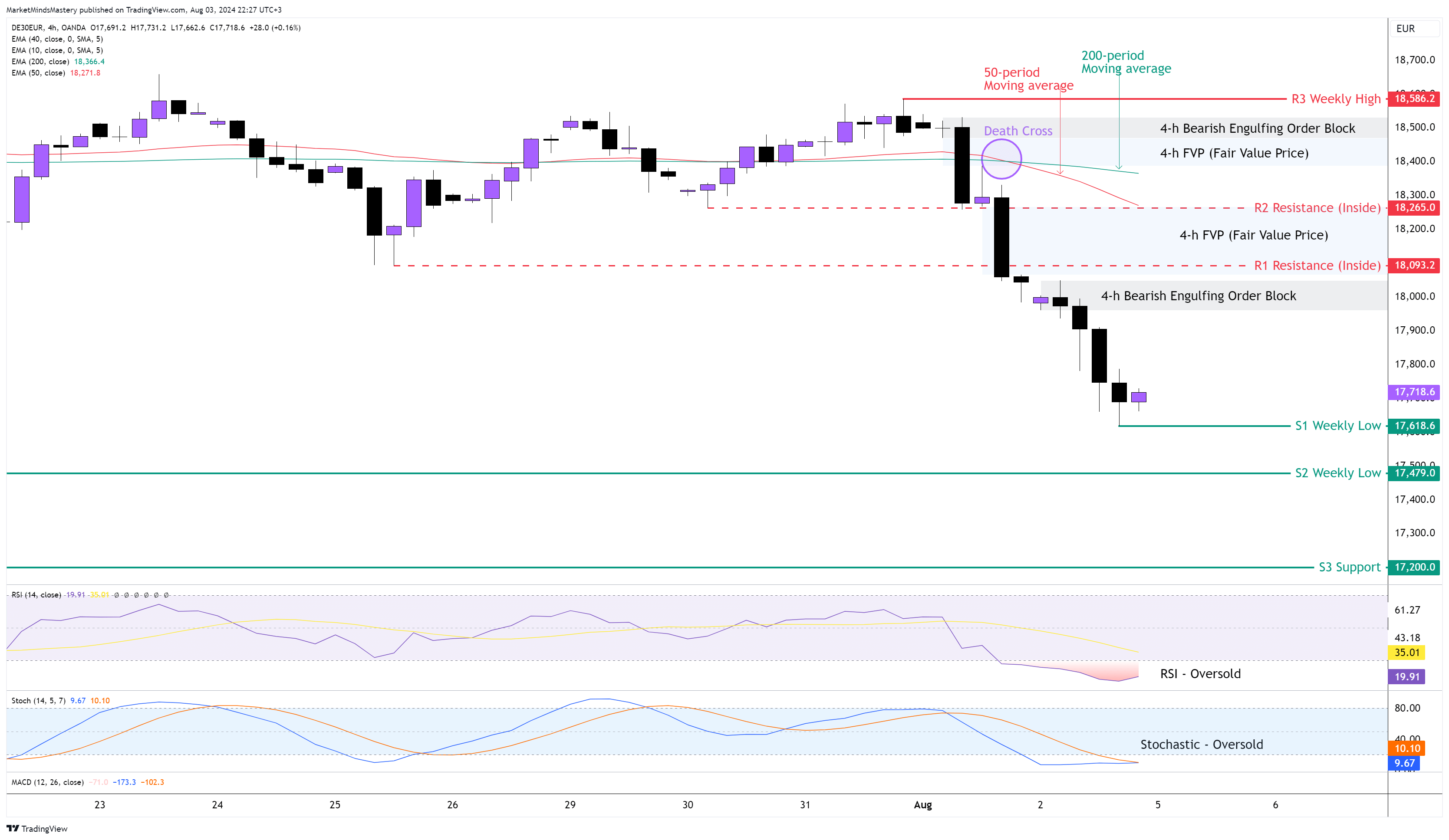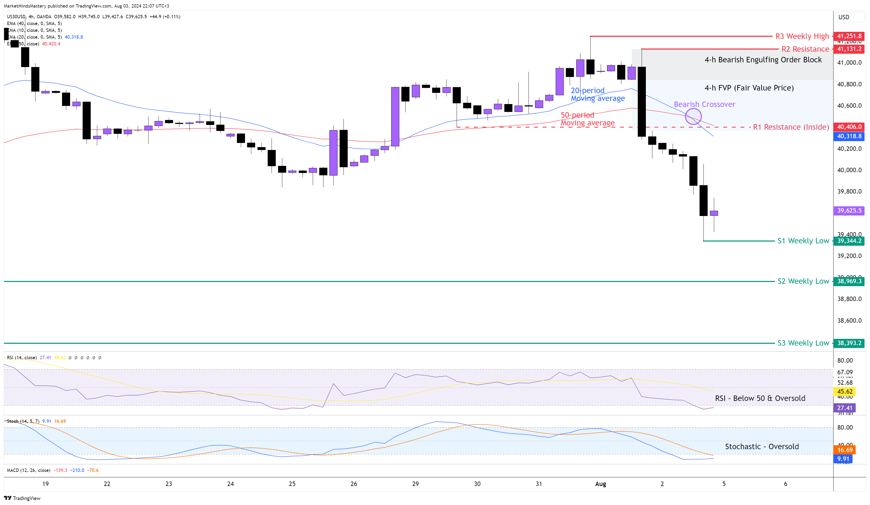 The price of the US30 experienced a strong sell-off last Thursday. In the previous week’s Market Outlook, we explained the importance of the Bullish Hammer after a mature uptrend and that it has bearish implications. This happened, and the price on the weekly chart ended up being a Bearish Engulfing Reversal candle. On the 4-hour chart, the market structure shifted and from an uptrend, it's on its way to a downtrend. The market has already made a lower low, and a lower high is required to confirm the downtrend. That said, the 20-period crossed below the 50-period, and this is bearish. The RSI is not only below 50 but also in an Oversold condition due to the strong and fast price decline last week. The Stochastic Oscillator is also in an Oversold condition and this is bearish. Starting Monday, if the price declines further, the first support area, S1, will be around $39344, which is the previous week’s low. In case the price penetrates the S1 and keeps moving downwards, the next support, S2, will be another weekly low price of approximately $38969. If the price penetrates the S2 and keeps lowering, the next support, S3, will be at $38393.