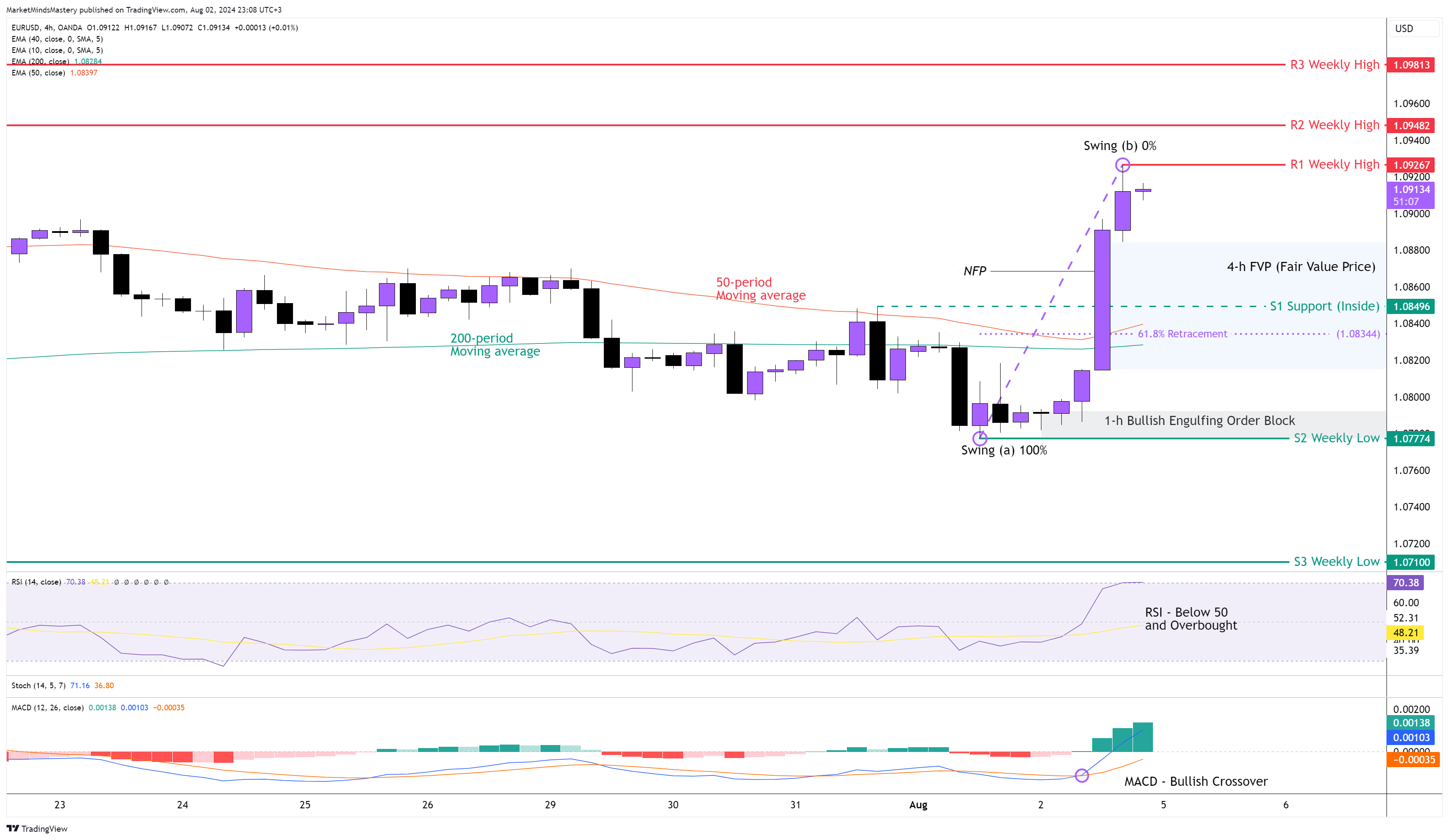 The 50-period is above the 200-period moving average, and this is Bullish. The RSI Oscillator is in an Overbought condition, signalling the strength of the upward move. The MACD, on the other hand, created a Bullish crossover while both the MACD Line and the Signal Line were below zero. The MACD’s Histogram now shows a Bullish upward move. During the upward move last Friday, the price created a Bullish Engulfing Order Block and FVP (Fair Value Price). There are significant areas on the price charts. Starting Monday, if the price continues its upward move, the first resistance area, R1, will be the previous week’s high of approximately 1.09267. If the price penetrates the R1 and continues to move upwards, the next resistance area, R2, will be another weekly high, around 1.09482. In higher time frames, it is considered a significant supply zone. A further upward move finds the R3 resistance area, around 1.09813.