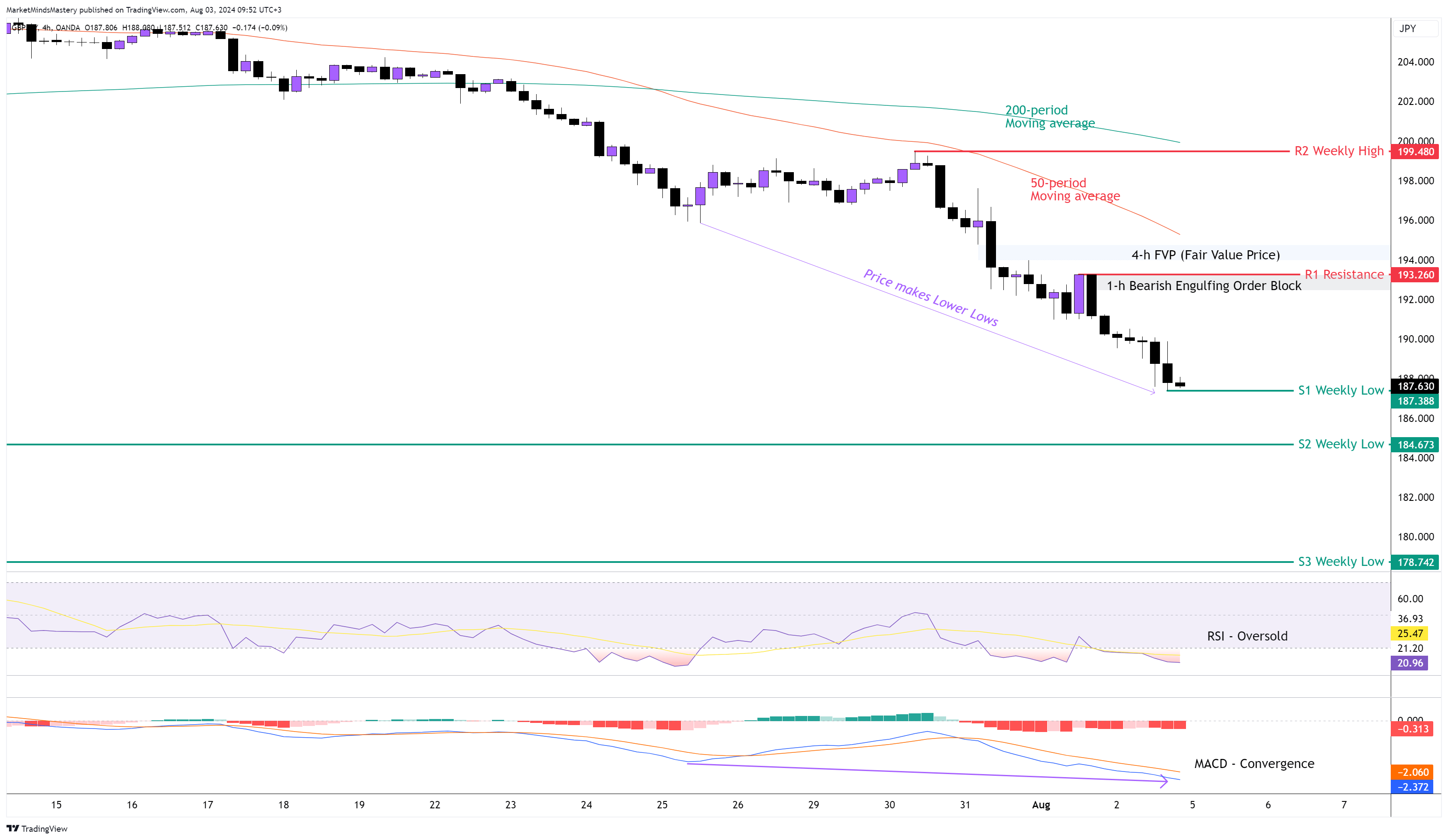 Starting Monday, if the price continues its downward move, the first support area, S1, will be the previous week’s low at 187.388. The previous week’s low and the weekly’s candle close were at the same price level. If the price penetrates the S1 and moves downwards, the next support area, S2, will be around 184.673, which is another weekly low price. In case the price bounces off and moves upwards, the first resistance area, R1, will be around 193.26. At the same price level, a Bearish Engulfing Order Block was created on the 1-hour chart last Thursday. If the price penetrates the R1 and keeps moving upwards, there is an unmitigated FVP around the 50-period moving average. The next static Resistance level, R2, is the previous week’s high, around 199.480.