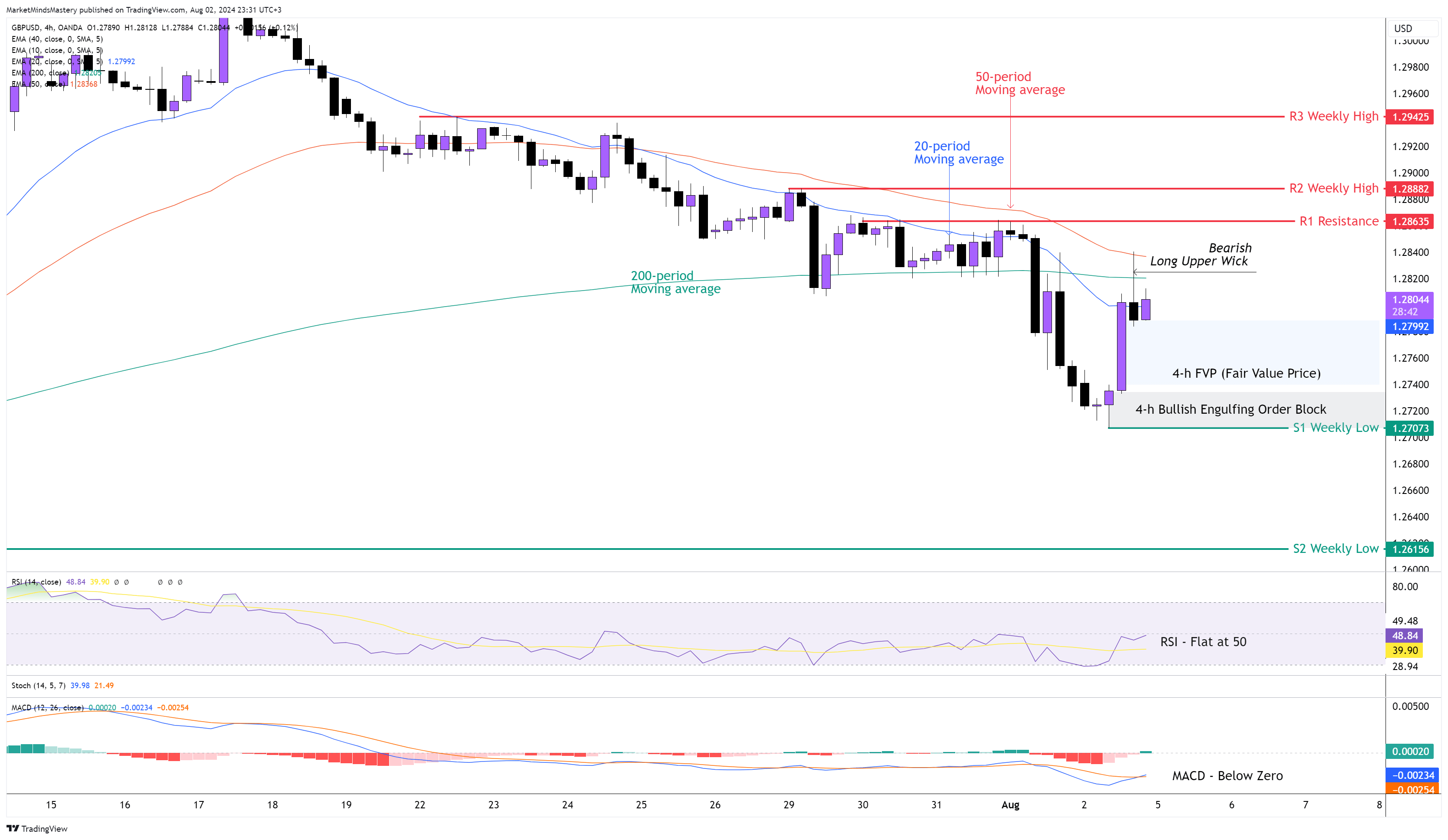 Last week, the Sterling was considered one of the most undervalued currencies as the BoE reported interest rates at 25 basis points less than the previous. A drop in the Interest Rates in the UK caused the Pound to depreciate, and the price chart shows a downtrend in the GBPUSD currency pair. On the 4-hour chart, the price maintains the lower highs and lower lows. The 20-period moving average is below the 50 period, and this is a bearish indication. The slow 200-period moving average is below the 50-period, which is a bullish indication. The RSI Oscillator is flat at around 50, and the MACD is below zero, but with a bullish crossover as the MACD Line (Blue) just now crossed above the Signal Line (Orange). Some of these indications are bullish, and some of them are bearish. The critical part of this currency pair is the Bearish candle with the Long Upper wick, which rejected the 50-period and the 200-period moving average last Friday, which, if will creates a new market structure next week, will resume the downtrend.