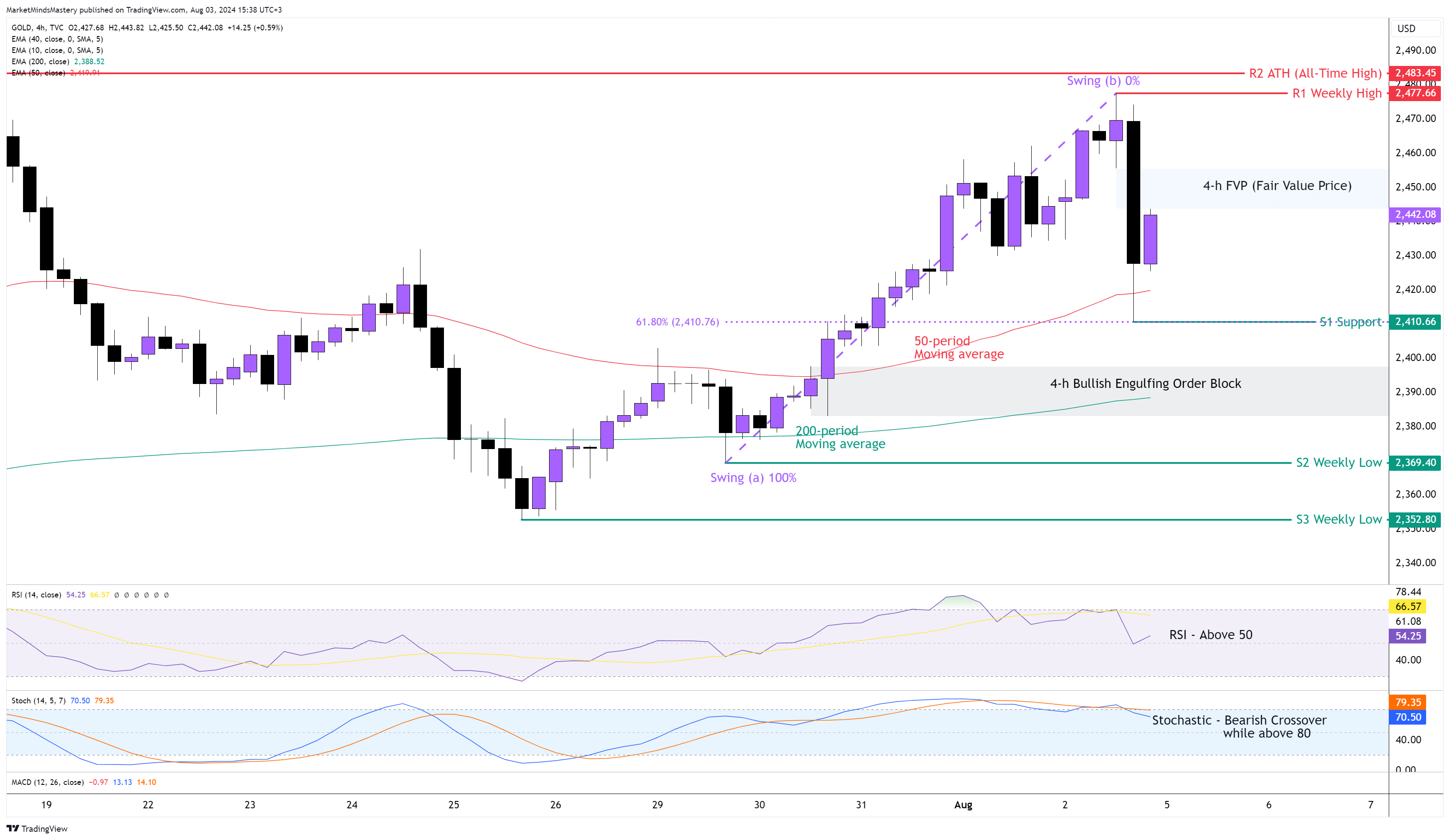 Following the Weekly’s primary uptrend, the price of Gold ended the intermediate downtrend on the 4-hour chart last Wednesday, and since then, it has aligned with the weekly’s uptrend. The 50-period moving average is above the 200-period, and this has bullish implications. Because the RSI is above 50, the market is considered bullish. The Stochastic Oscillator, on the other hand, created a bearish crossover while it was in an Overbought condition, as the %K Line (Blue) crossed below the %K Line (Orange), and this has bearish implications. The reason for this is that the price entered into a corrective phase on the 4-hour chart, and as the %K Line measures the last 5 periods, it reacted fast following the price. As per the swing analysis, the price now makes higher highs and higher lows, a market structure that indicates an uptrend. Last Friday, the price bounced off the 50-period moving average. If the price continues to move upwards, the first resistance area, R1, will be the previous week’s high, around $2477. Around the area of $2450, the market created an FVP (Fair Value Price). If the price surpasses the R1 level and increases, the next resistance area, R2, is the $2483, which is the ATH (All-Time High).
